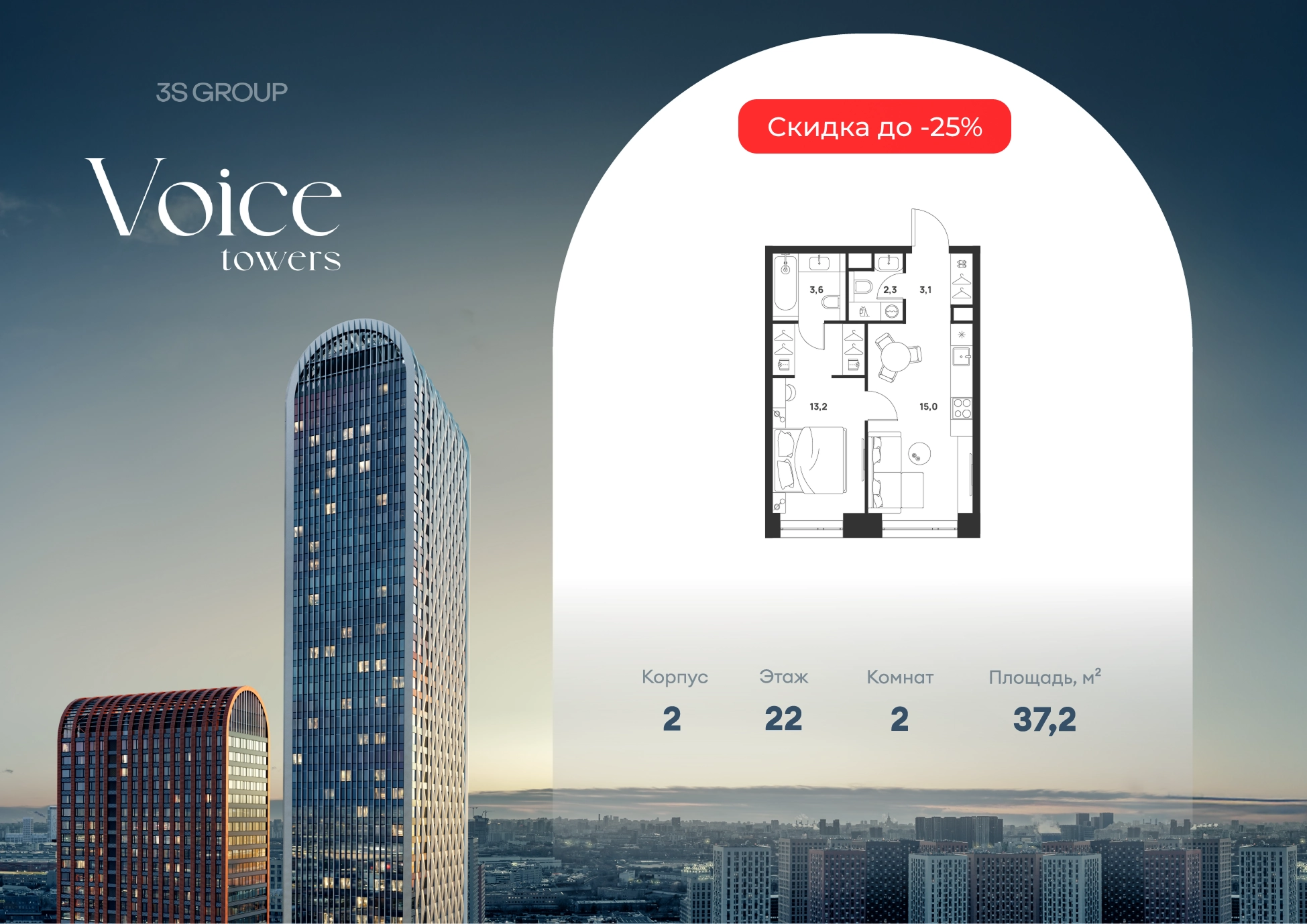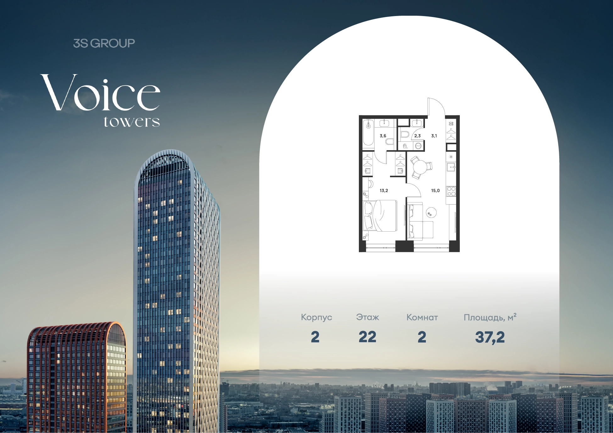 Ипотека от 3,5% на весь срок. Дополнительная скидка в офисе продаж! Продается уютная 1-комн. квартира площадью 37,2 кв.м на 22 этаже жилого комплекса бизнес-класса Voice Towers от 3S Group. Общая площадь: 37,2 кв.м., жилая: 23,2 кв.м., площадь кухни-гостиной: 15 кв.м., высокие потолки: 3,12 м., санузел раздельный. О проекте: Voice. Высокие стандарты жизни Мы уверены, что высокие идеалы неизменно помогают достигать высот. Создавая Voice, мы ориентировались на людей с высокими требованиями к качеству и безупречным вкусом. Башни жилого комплекса, сочетают элегантную форму с динамичной геометрией фасадов, устремляются ввысь и отвечают самым высоким стандартам строительства. Технологичность, воплощенная в архитектуре - это ваш, собственный Voice. Преимущества локации Близость к метро Текстильщики, БКЛ и МЦК Новохохловская (10 мин) Рядом природный заповедник и конно-спортивная база Кузьминки-Люблино Будущее окружение Проект Южный порт - Текстильщики с деловым центром Сити-2 Небоскребы высотой до 300м Культурный центр с амфитеатром Променад вдоль Москвы-реки и яхт-клуб Архитектура Проект от Архитектурной мастерской Алексея Ильина Две перпендикулярные башни с арочными вершинами Высокая башня: светло-серый металл Низкая башня: терракотовая керамика Благоустройство Внешняя зона: парковки, магазины, кафе Внутренний двор: закрытая территория с озеленением Шумозащитный экран Сезонное озеленение Встречи на высоте Гранд-лобби высотой 8м Дизайнерская мебель Умные скоростные лифты Услуги Детский центр с игровой зоной Фитнес-студия для жителей
