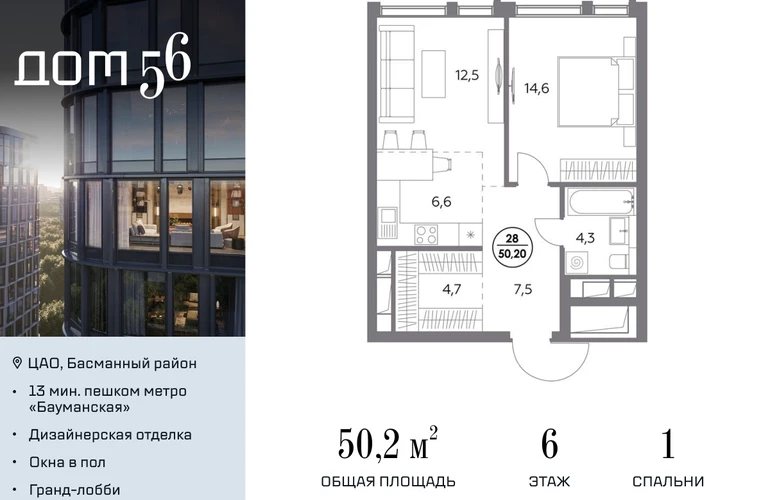 В премиум-квартале «Дом 56» на Бауманской напрямую от девелопера ГК «Галс-Девелопмент» представлена 1-комнатная квартира на 6 этаже общей площадью 50.20 м². <br> <br>Квартира с качественной отделкой в одном из двух вариантов - Smart White и Casual Grey. Финишная отделка будет выполнена «под ключ» - от возведения внутренних перегородок до установки встроенных светильников. В отделке будут использованы высококачественные премиальные материалы, в том числе керамогранит с текстурой мрамора Калакатта и благородного иранского известняка, а также напольное покрытие из дубовой инженерной доски. Ванные комнаты полностью укомплектовываются премиальной сантехникой немецких брендов, включая дизайнерские тумбы под раковину и душевые стойки с системой термостат. <br> <br>«Дом 56» — расположен в Басманном районе на ул. Фридриха Энгельса, всего в 12-15 минутах пешком от станций метро «Бауманская» и «Электрозаводская». <br> <br>Рядом с премиум-кварталом находятся важные городские магистрали — ТТК, набережная реки Яузы и Бакунинская улица, переходящая в Спартаковскую и Маросейку. <br> <br>Архитектурный стиль «Дома 56» — параметрический минимализм. Футуристические фасады квартала с «эффектом закручивания» словно вращаются вокруг своей оси. Динамичный образ башен дополняет эффектное остекление — окна в пол будут в каждой квартире. <br> <br>«Дом 56» станет органичным продолжением современной научно-креативной среды Басманного района: <br> <br>— Развитое окружение — десятки различных точек притяжения; <br>— Близость престижных вузов: МГТУ, МЭИ и Британская высшая школа дизайна; <br>— Соседство с Технологической долиной и всем необходимым для запуска стартапа; <br>— Набережные и парки для спорта и отдыха. <br> <br>«Дом 56» оснащён первоклассными инженерными системами. Входы на территорию, в здание и паркинг оборудованы системой контроля и управления доступом. С любого этажа в лобби и паркинг спускаются быстрые и бесшумные лифты премиального бренда. <br> <br>Во внутреннем приватном дворе будет создано пространство в бионическом стиле с лаунж-зонами, подвесными качелями, детскими плейхабами для разных возрастов, площадками для спорта и отдыха в окружении зелени. <br>На двух подземных уровнях предусмотрен подземный паркинг и кладовые помещения. <br>О застройщике