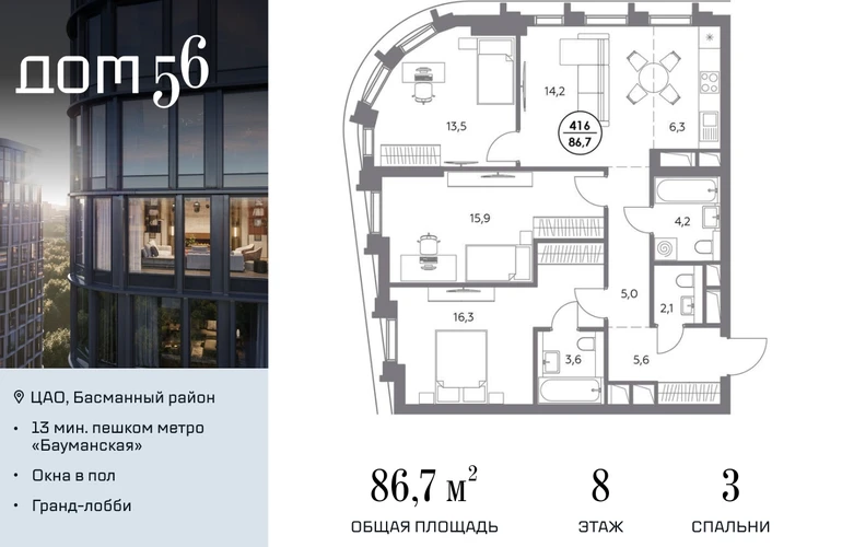 В премиум-квартале «Дом 56» на Бауманской напрямую от девелопера ГК «Галс-Девелопмент» представлена 3-комнатная квартира на 8 этаже общей площадью 86.70 м². <br> <br>Квартира предлагается без отделки, со свободной планировкой. Пространство позволяет воплотить дизайн - проект в соответствии с Вашими предпочтениями. <br> <br>«Дом 56» — расположен в Басманном районе на ул. Фридриха Энгельса, всего в 12-15 минутах пешком от станций метро «Бауманская» и «Электрозаводская». <br> <br>Рядом с премиум-кварталом находятся важные городские магистрали — ТТК, набережная реки Яузы и Бакунинская улица, переходящая в Спартаковскую и Маросейку. <br> <br>Архитектурный стиль «Дома 56» — параметрический минимализм. Футуристические фасады квартала с «эффектом закручивания» словно вращаются вокруг своей оси. Динамичный образ башен дополняет эффектное остекление — окна в пол будут в каждой квартире. <br> <br>«Дом 56» станет органичным продолжением современной научно-креативной среды Басманного района: <br> <br>— Развитое окружение — десятки различных точек притяжения; <br>— Близость престижных вузов: МГТУ, МЭИ и Британская высшая школа дизайна; <br>— Соседство с Технологической долиной и всем необходимым для запуска стартапа; <br>— Набережные и парки для спорта и отдыха. <br> <br>«Дом 56» оснащён первоклассными инженерными системами. Входы на территорию, в здание и паркинг оборудованы системой контроля и управления доступом. С любого этажа в лобби и паркинг спускаются быстрые и бесшумные лифты премиального бренда. <br> <br>Во внутреннем приватном дворе будет создано пространство в бионическом стиле с лаунж-зонами, подвесными качелями, детскими плейхабами для разных возрастов, площадками для спорта и отдыха в окружении зелени. <br>На двух подземных уровнях предусмотрен подземный паркинг и кладовые помещения. <br>О застройщике