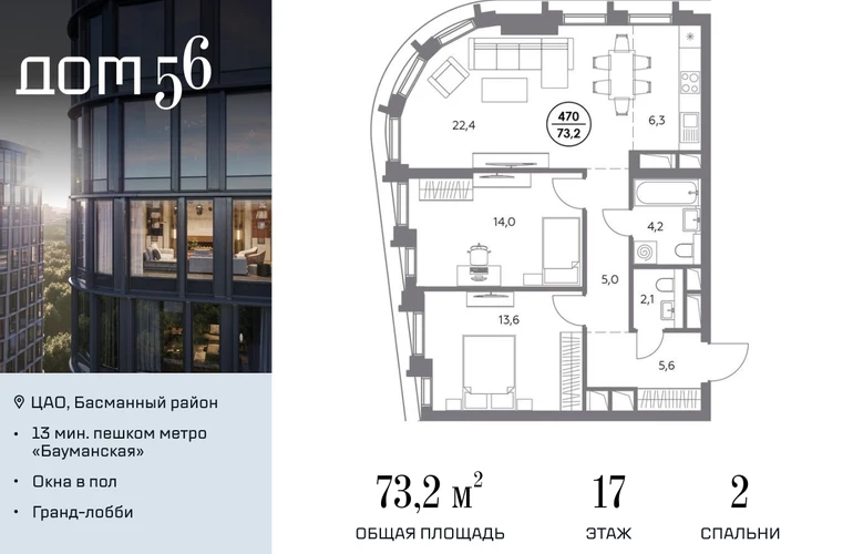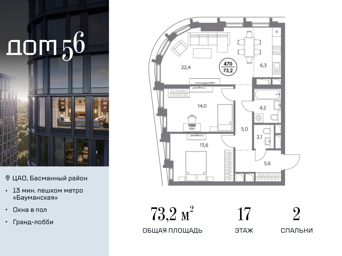 В премиум-квартале «Дом 56» на Бауманской напрямую от девелопера ГК «Галс-Девелопмент» представлена 2-комнатная квартира на 17 этаже общей площадью 73.20 м². <br> <br>Квартира предлагается без отделки, со свободной планировкой. Пространство позволяет воплотить дизайн - проект в соответствии с Вашими предпочтениями. <br> <br>«Дом 56» — расположен в Басманном районе на ул. Фридриха Энгельса, всего в 12-15 минутах пешком от станций метро «Бауманская» и «Электрозаводская». <br> <br>Рядом с премиум-кварталом находятся важные городские магистрали — ТТК, набережная реки Яузы и Бакунинская улица, переходящая в Спартаковскую и Маросейку. <br> <br>Архитектурный стиль «Дома 56» — параметрический минимализм. Футуристические фасады квартала с «эффектом закручивания» словно вращаются вокруг своей оси. Динамичный образ башен дополняет эффектное остекление — окна в пол будут в каждой квартире. <br> <br>«Дом 56» станет органичным продолжением современной научно-креативной среды Басманного района: <br> <br>— Развитое окружение — десятки различных точек притяжения; <br>— Близость престижных вузов: МГТУ, МЭИ и Британская высшая школа дизайна; <br>— Соседство с Технологической долиной и всем необходимым для запуска стартапа; <br>— Набережные и парки для спорта и отдыха. <br> <br>«Дом 56» оснащён первоклассными инженерными системами. Входы на территорию, в здание и паркинг оборудованы системой контроля и управления доступом. С любого этажа в лобби и паркинг спускаются быстрые и бесшумные лифты премиального бренда. <br> <br>Во внутреннем приватном дворе будет создано пространство в бионическом стиле с лаунж-зонами, подвесными качелями, детскими плейхабами для разных возрастов, площадками для спорта и отдыха в окружении зелени. <br>На двух подземных уровнях предусмотрен подземный паркинг и кладовые помещения. <br>О застройщике