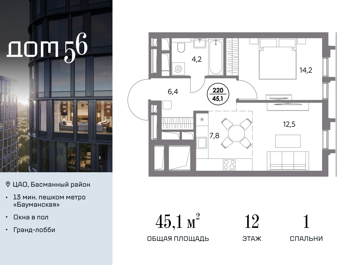 В премиум-квартале «Дом 56» на Бауманской напрямую от девелопера ГК «Галс-Девелопмент» представлена 1-комнатная квартира на 12 этаже общей площадью 45.10 м². <br> <br>Квартира предлагается без отделки, со свободной планировкой. Пространство позволяет воплотить дизайн - проект в соответствии с Вашими предпочтениями. <br> <br>«Дом 56» — расположен в Басманном районе на ул. Фридриха Энгельса, всего в 12-15 минутах пешком от станций метро «Бауманская» и «Электрозаводская». <br> <br>Рядом с премиум-кварталом находятся важные городские магистрали — ТТК, набережная реки Яузы и Бакунинская улица, переходящая в Спартаковскую и Маросейку. <br> <br>Архитектурный стиль «Дома 56» — параметрический минимализм. Футуристические фасады квартала с «эффектом закручивания» словно вращаются вокруг своей оси. Динамичный образ башен дополняет эффектное остекление — окна в пол будут в каждой квартире. <br> <br>«Дом 56» станет органичным продолжением современной научно-креативной среды Басманного района: <br> <br>— Развитое окружение — десятки различных точек притяжения; <br>— Близость престижных вузов: МГТУ, МЭИ и Британская высшая школа дизайна; <br>— Соседство с Технологической долиной и всем необходимым для запуска стартапа; <br>— Набережные и парки для спорта и отдыха. <br> <br>«Дом 56» оснащён первоклассными инженерными системами. Входы на территорию, в здание и паркинг оборудованы системой контроля и управления доступом. С любого этажа в лобби и паркинг спускаются быстрые и бесшумные лифты премиального бренда. <br> <br>Во внутреннем приватном дворе будет создано пространство в бионическом стиле с лаунж-зонами, подвесными качелями, детскими плейхабами для разных возрастов, площадками для спорта и отдыха в окружении зелени. <br>На двух подземных уровнях предусмотрен подземный паркинг и кладовые помещения. <br>О застройщике