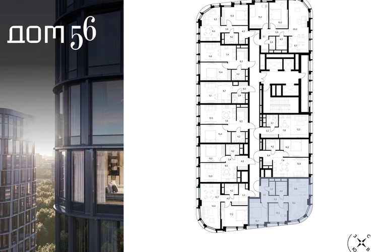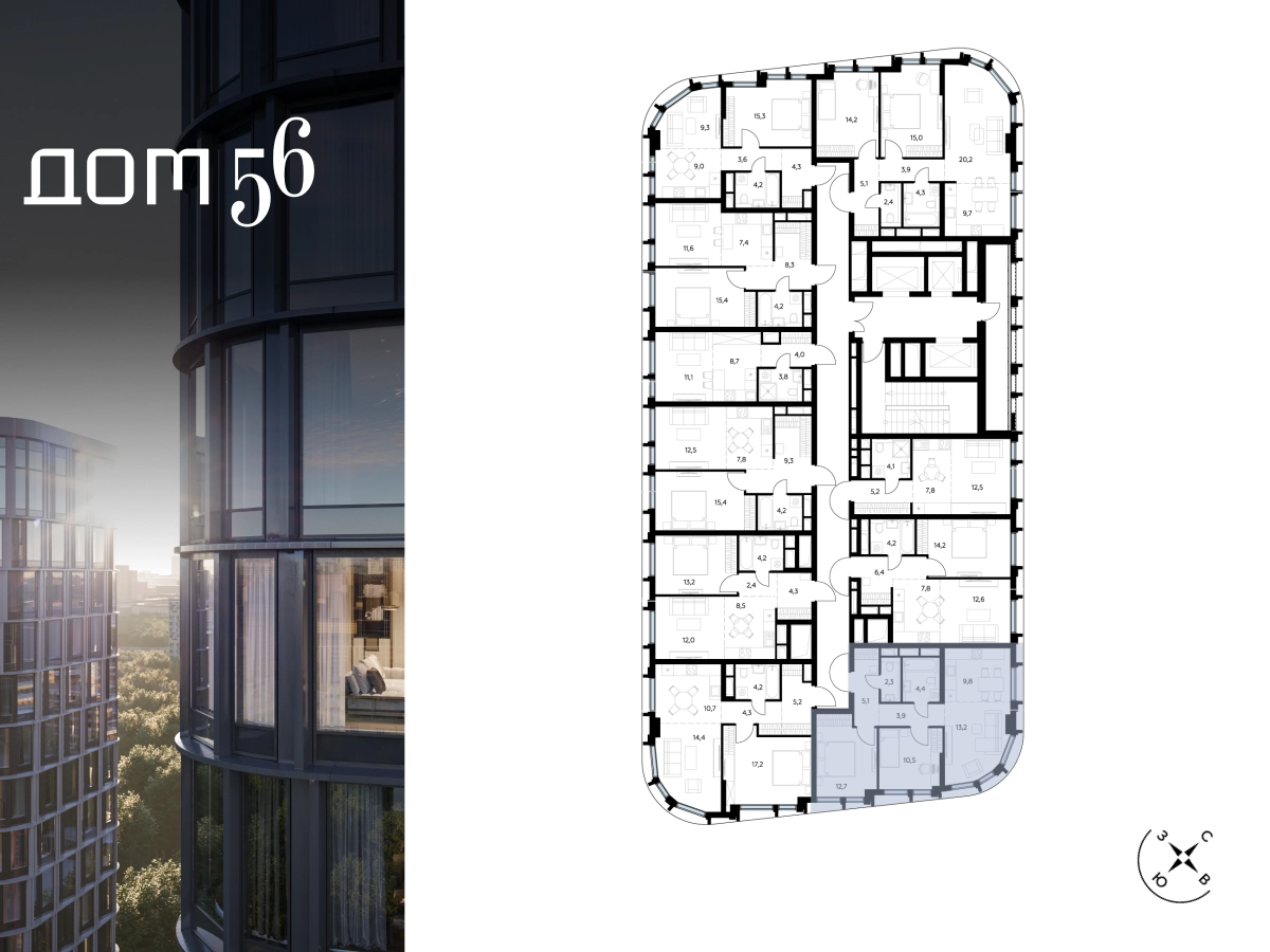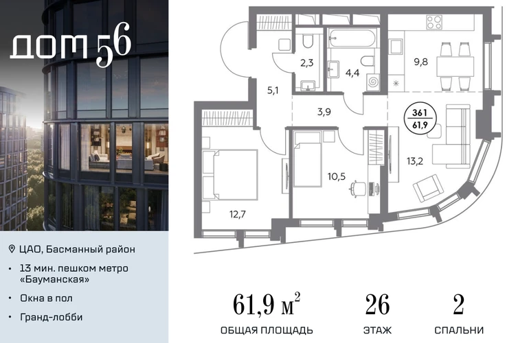 В премиум-квартале «Дом 56» на Бауманской напрямую от девелопера ГК «Галс-Девелопмент» представлена 2-комнатная квартира на 26 этаже общей площадью 61.90 м². Квартира предлагается без отделки, со свободной планировкой. Пространство позволяет воплотить дизайн - проект в соответствии с Вашими предпочтениями. «Дом 56» — расположен в Басманном районе на ул. Фридриха Энгельса, всего в 12-15 минутах пешком от станций метро «Бауманская» и «Электрозаводская». Рядом с премиум-кварталом находятся важные городские магистрали — ТТК, набережная реки Яузы и Бакунинская улица, переходящая в Спартаковскую и Маросейку. Архитектурный стиль «Дома 56» — параметрический минимализм. Футуристические фасады квартала с «эффектом закручивания» словно вращаются вокруг своей оси. Динамичный образ башен дополняет эффектное остекление — окна в пол будут в каждой квартире. «Дом 56» станет органичным продолжением современной научно-креативной среды Басманного района: — Развитое окружение — десятки различных точек притяжения; — Близость престижных вузов: МГТУ, МЭИ и Британская высшая школа дизайна; — Соседство с Технологической долиной и всем необходимым для запуска стартапа; — Набережные и парки для спорта и отдыха. «Дом 56» оснащён первоклассными инженерными системами. Входы на территорию, в здание и паркинг оборудованы системой контроля и управления доступом. С любого этажа в лобби и паркинг спускаются быстрые и бесшумные лифты премиального бренда. Во внутреннем приватном дворе будет создано пространство в бионическом стиле с лаунж-зонами, подвесными качелями, детскими плейхабами для разных возрастов, площадками для спорта и отдыха в окружении зелени. На двух подземных уровнях предусмотрен подземный паркинг и кладовые помещения.О застройщике