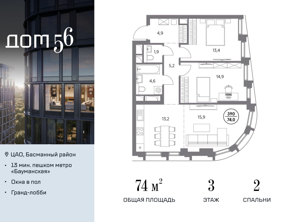 В премиум-квартале «Дом 56» на Бауманской напрямую от девелопера ГК «Галс-Девелопмент» представлена 2-комнатная квартира на 3 этаже общей площадью 74.00 м². Квартира предлагается без отделки, со свободной планировкой. Пространство позволяет воплотить дизайн - проект в соответствии с Вашими предпочтениями. «Дом 56» — расположен в Басманном районе на ул. Фридриха Энгельса, всего в 12-15 минутах пешком от станций метро «Бауманская» и «Электрозаводская». Рядом с премиум-кварталом находятся важные городские магистрали — ТТК, набережная реки Яузы и Бакунинская улица, переходящая в Спартаковскую и Маросейку. Архитектурный стиль «Дома 56» — параметрический минимализм. Футуристические фасады квартала с «эффектом закручивания» словно вращаются вокруг своей оси. Динамичный образ башен дополняет эффектное остекление — окна в пол будут в каждой квартире. «Дом 56» станет органичным продолжением современной научно-креативной среды Басманного района: — Развитое окружение — десятки различных точек притяжения; — Близость престижных вузов: МГТУ, МЭИ и Британская высшая школа дизайна; — Соседство с Технологической долиной и всем необходимым для запуска стартапа; — Набережные и парки для спорта и отдыха. «Дом 56» оснащён первоклассными инженерными системами. Входы на территорию, в здание и паркинг оборудованы системой контроля и управления доступом. С любого этажа в лобби и паркинг спускаются быстрые и бесшумные лифты премиального бренда. Во внутреннем приватном дворе будет создано пространство в бионическом стиле с лаунж-зонами, подвесными качелями, детскими плейхабами для разных возрастов, площадками для спорта и отдыха в окружении зелени. На двух подземных уровнях предусмотрен подземный паркинг и кладовые помещения.О застройщике