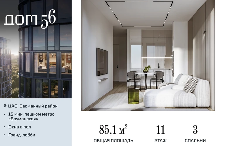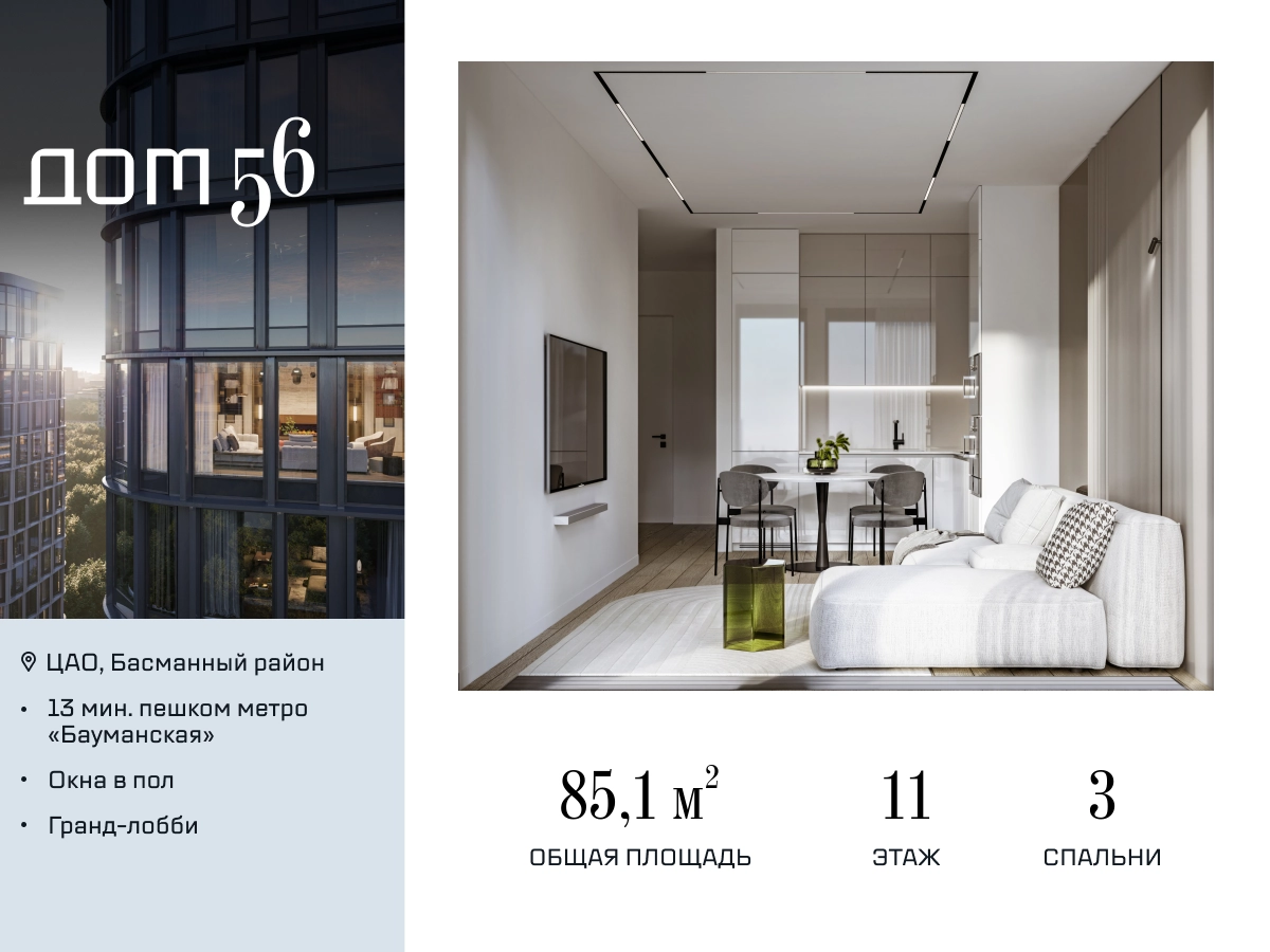 В премиум-квартале «Дом 56» на Бауманской напрямую от девелопера ГК «Галс-Девелопмент» представлена 3-комнатная квартира на 11 этаже общей площадью 85.10 м². Квартира предлагается без отделки, со свободной планировкой. Пространство позволяет воплотить дизайн - проект в соответствии с Вашими предпочтениями. «Дом 56» — расположен в Басманном районе на ул. Фридриха Энгельса, всего в 12-15 минутах пешком от станций метро «Бауманская» и «Электрозаводская». Рядом с премиум-кварталом находятся важные городские магистрали — ТТК, набережная реки Яузы и Бакунинская улица, переходящая в Спартаковскую и Маросейку. Архитектурный стиль «Дома 56» — параметрический минимализм. Футуристические фасады квартала с «эффектом закручивания» словно вращаются вокруг своей оси. Динамичный образ башен дополняет эффектное остекление — окна в пол будут в каждой квартире. «Дом 56» станет органичным продолжением современной научно-креативной среды Басманного района: — Развитое окружение — десятки различных точек притяжения; — Близость престижных вузов: МГТУ, МЭИ и Британская высшая школа дизайна; — Соседство с Технологической долиной и всем необходимым для запуска стартапа; — Набережные и парки для спорта и отдыха. «Дом 56» оснащён первоклассными инженерными системами. Входы на территорию, в здание и паркинг оборудованы системой контроля и управления доступом. С любого этажа в лобби и паркинг спускаются быстрые и бесшумные лифты премиального бренда. Во внутреннем приватном дворе будет создано пространство в бионическом стиле с лаунж-зонами, подвесными качелями, детскими плейхабами для разных возрастов, площадками для спорта и отдыха в окружении зелени. На двух подземных уровнях предусмотрен подземный паркинг и кладовые помещения.О застройщике