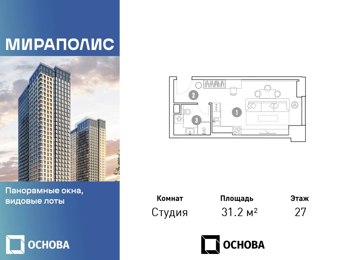 Продается студия площадью 31.2 кв.м. на 27-м этаже 33 этажного дома в ЖК "Мираполис" от ГК ОСНОВА. МИРАПОЛИС - проект для тех, кому важно, чтобы под рукой было всё для работы, отдыха и жизни. Проект состоит из четырех башен с авторскими стеклянными фасадами и lounge-rooftop под открытым небом. С высоты птичьего полета резиденты будут наслаждаться видами на город и расположенные рядом парки: "Лосиный остров", "Сокольники", "Ботанический сад", "Сад будущего" и "ВДНХ". МИРАПОЛИС расположен в 3 минутах пешком от МЦК "Ростокино". За 5 минут - можно добраться до ст.м. ВДНХ на машине, а быстрый выезд на главные транспортные магистрали (ТТК и Проспект мира) позволит доехать на личном авто до центра Москвы за полчаса. В просторных лобби с дизайнерской отделкой продуман круглосуточный консьерж-сервис, приватные зоны с мягкой мебелью и комнаты для мытья лап питомцам. Панорамные окна и потолки высотой 3,1 м, а система "умный дом" значительно упростит жизнь резидентам и автоматизирует бытовые процессы. Концептуальный проект предлагает все преимущества бизнес-класса: подземный паркинг, торговый центр и супермаркет, фитнес-клуб, бассейн и SPA, офисы и коворкинги - всё для полноценной и комфортной жизни в столице.О застройщике
