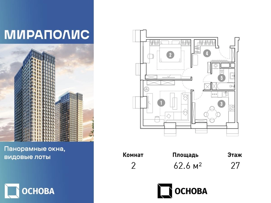 Продаются 2-к апартаменты площадью 62.6 кв.м. на 27-м этаже 33 этажного дома в ЖК "Мираполис" от ГК ОСНОВА. МИРАПОЛИС - проект для тех, кому важно, чтобы под рукой было всё для работы, отдыха и жизни. Проект состоит из четырех башен с авторскими стеклянными фасадами и lounge-rooftop под открытым небом. С высоты птичьего полета резиденты будут наслаждаться видами на город и расположенные рядом парки: "Лосиный остров", "Сокольники", "Ботанический сад", "Сад будущего" и "ВДНХ". МИРАПОЛИС расположен в 3 минутах пешком от МЦК "Ростокино". За 5 минут - можно добраться до ст.м. ВДНХ на машине, а быстрый выезд на главные транспортные магистрали (ТТК и Проспект мира) позволит доехать на личном авто до центра Москвы за полчаса. В просторных лобби с дизайнерской отделкой продуман круглосуточный консьерж-сервис, приватные зоны с мягкой мебелью и комнаты для мытья лап питомцам. Панорамные окна и потолки высотой 3,1 м, а система "умный дом" значительно упростит жизнь резидентам и автоматизирует бытовые процессы. Концептуальный проект предлагает все преимущества бизнес-класса: подземный паркинг, торговый центр и супермаркет, фитнес-клуб, бассейн и SPA, офисы и коворкинги - всё для полноценной и комфортной жизни в столице.О застройщике