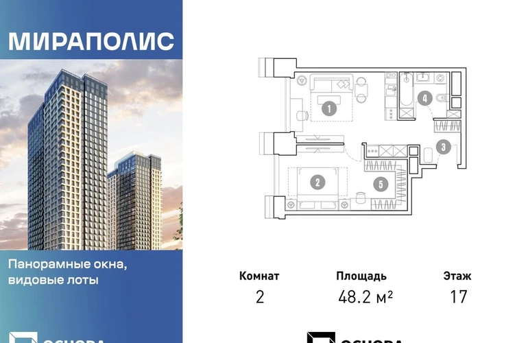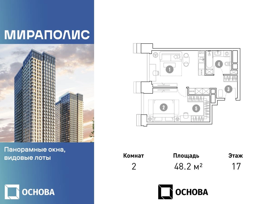 Продаются 2-к апартаменты площадью 48.2 кв.м. на 17-м этаже 33 этажного дома в ЖК "Мираполис" от ГК ОСНОВА. МИРАПОЛИС - проект для тех, кому важно, чтобы под рукой было всё для работы, отдыха и жизни. Проект состоит из четырех башен с авторскими стеклянными фасадами и lounge-rooftop под открытым небом. С высоты птичьего полета резиденты будут наслаждаться видами на город и расположенные рядом парки: "Лосиный остров", "Сокольники", "Ботанический сад", "Сад будущего" и "ВДНХ". МИРАПОЛИС расположен в 3 минутах пешком от МЦК "Ростокино". За 5 минут - можно добраться до ст.м. ВДНХ на машине, а быстрый выезд на главные транспортные магистрали (ТТК и Проспект мира) позволит доехать на личном авто до центра Москвы за полчаса. В просторных лобби с дизайнерской отделкой продуман круглосуточный консьерж-сервис, приватные зоны с мягкой мебелью и комнаты для мытья лап питомцам. Панорамные окна и потолки высотой 3,1 м, а система "умный дом" значительно упростит жизнь резидентам и автоматизирует бытовые процессы. Концептуальный проект предлагает все преимущества бизнес-класса: подземный паркинг, торговый центр и супермаркет, фитнес-клуб, бассейн и SPA, офисы и коворкинги - всё для полноценной и комфортной жизни в столице.О застройщике