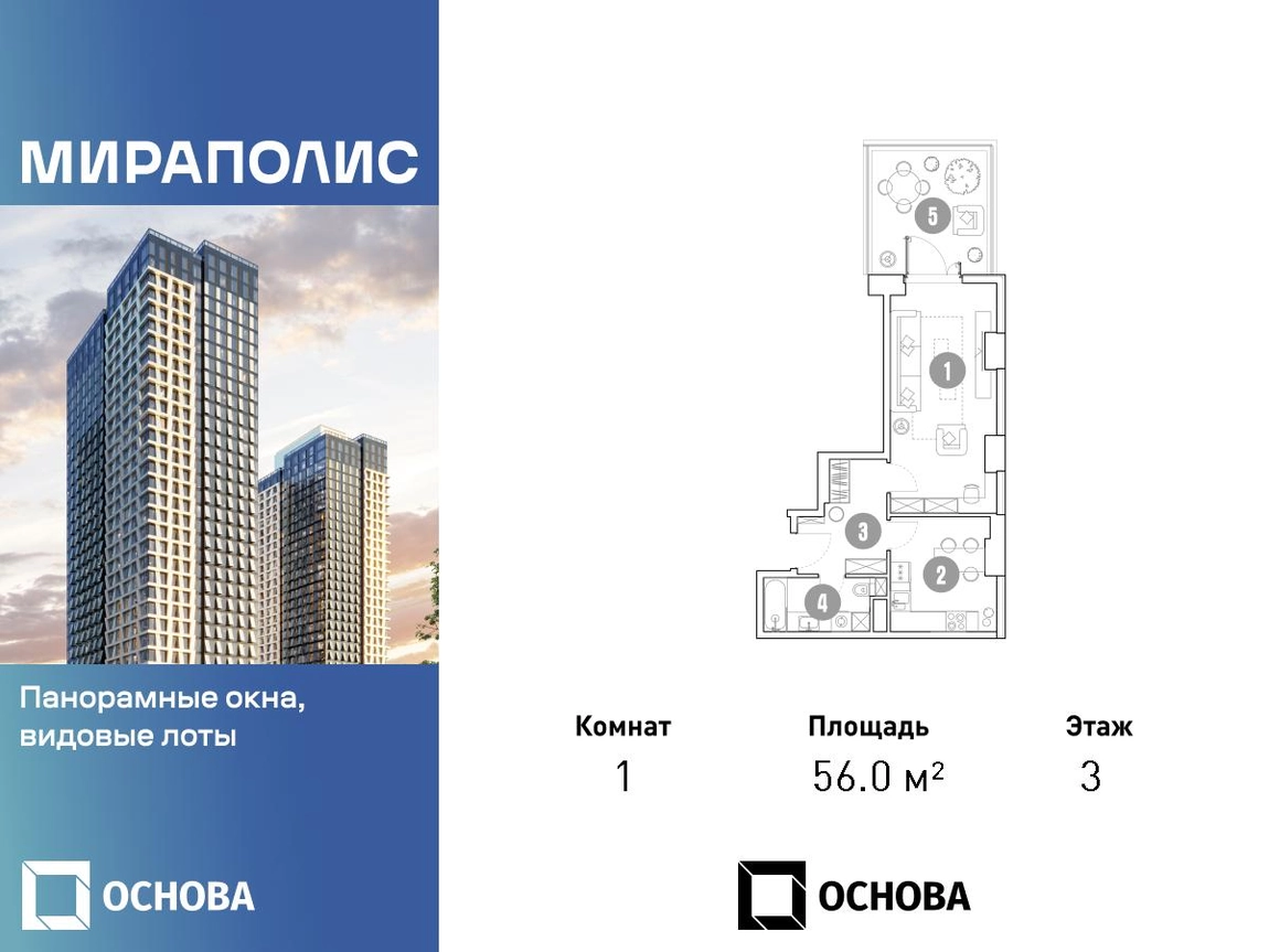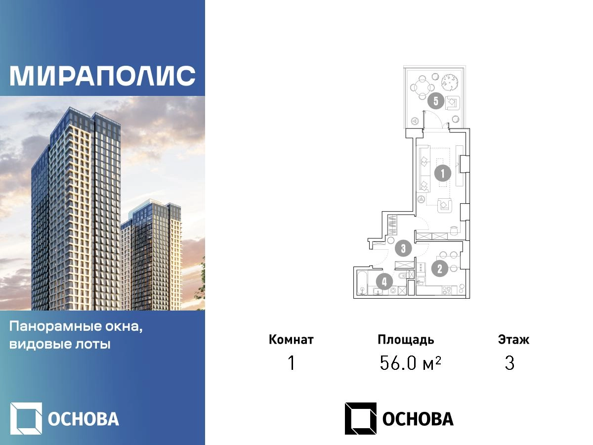Продаются 1-к апартаменты площадью 56.0 кв.м. на 3-м этаже 33 этажного дома в ЖК "Мираполис" от ГК ОСНОВА. МИРАПОЛИС - проект для тех, кому важно, чтобы под рукой было всё для работы, отдыха и жизни. Проект состоит из четырех башен с авторскими стеклянными фасадами и lounge-rooftop под открытым небом. С высоты птичьего полета резиденты будут наслаждаться видами на город и расположенные рядом парки: "Лосиный остров", "Сокольники", "Ботанический сад", "Сад будущего" и "ВДНХ". МИРАПОЛИС расположен в 3 минутах пешком от МЦК "Ростокино". За 5 минут - можно добраться до ст.м. ВДНХ на машине, а быстрый выезд на главные транспортные магистрали (ТТК и Проспект мира) позволит доехать на личном авто до центра Москвы за полчаса. В просторных лобби с дизайнерской отделкой продуман круглосуточный консьерж-сервис, приватные зоны с мягкой мебелью и комнаты для мытья лап питомцам. Панорамные окна и потолки высотой 3,1 м, а система "умный дом" значительно упростит жизнь резидентам и автоматизирует бытовые процессы. Концептуальный проект предлагает все преимущества бизнес-класса: подземный паркинг, торговый центр и супермаркет, фитнес-клуб, бассейн и SPA, офисы и коворкинги - всё для полноценной и комфортной жизни в столице.О застройщике