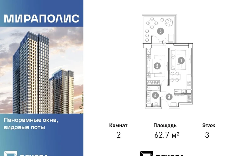 Продаются 2-к апартаменты площадью 62.7 кв.м. на 3-м этаже 33 этажного дома в ЖК "Мираполис" от ГК ОСНОВА. МИРАПОЛИС - проект для тех, кому важно, чтобы под рукой было всё для работы, отдыха и жизни. Проект состоит из четырех башен с авторскими стеклянными фасадами и lounge-rooftop под открытым небом. С высоты птичьего полета резиденты будут наслаждаться видами на город и расположенные рядом парки: "Лосиный остров", "Сокольники", "Ботанический сад", "Сад будущего" и "ВДНХ". МИРАПОЛИС расположен в 3 минутах пешком от МЦК "Ростокино". За 5 минут - можно добраться до ст.м. ВДНХ на машине, а быстрый выезд на главные транспортные магистрали (ТТК и Проспект мира) позволит доехать на личном авто до центра Москвы за полчаса. В просторных лобби с дизайнерской отделкой продуман круглосуточный консьерж-сервис, приватные зоны с мягкой мебелью и комнаты для мытья лап питомцам. Панорамные окна и потолки высотой 3,1 м, а система "умный дом" значительно упростит жизнь резидентам и автоматизирует бытовые процессы. Концептуальный проект предлагает все преимущества бизнес-класса: подземный паркинг, торговый центр и супермаркет, фитнес-клуб, бассейн и SPA, офисы и коворкинги - всё для полноценной и комфортной жизни в столице.О застройщике