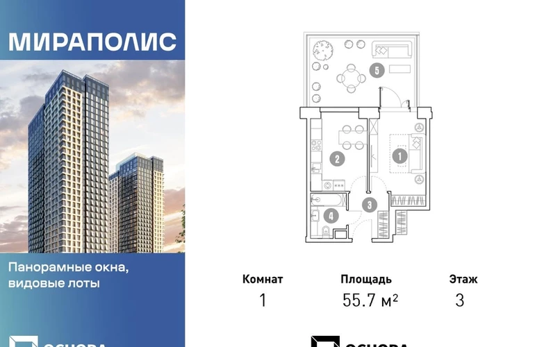 Продаются 1-к апартаменты площадью 55.7 кв.м. на 3-м этаже 33 этажного дома в ЖК "Мираполис" от ГК ОСНОВА. МИРАПОЛИС - проект для тех, кому важно, чтобы под рукой было всё для работы, отдыха и жизни. Проект состоит из четырех башен с авторскими стеклянными фасадами и lounge-rooftop под открытым небом. С высоты птичьего полета резиденты будут наслаждаться видами на город и расположенные рядом парки: "Лосиный остров", "Сокольники", "Ботанический сад", "Сад будущего" и "ВДНХ". МИРАПОЛИС расположен в 3 минутах пешком от МЦК "Ростокино". За 5 минут - можно добраться до ст.м. ВДНХ на машине, а быстрый выезд на главные транспортные магистрали (ТТК и Проспект мира) позволит доехать на личном авто до центра Москвы за полчаса. В просторных лобби с дизайнерской отделкой продуман круглосуточный консьерж-сервис, приватные зоны с мягкой мебелью и комнаты для мытья лап питомцам. Панорамные окна и потолки высотой 3,1 м, а система "умный дом" значительно упростит жизнь резидентам и автоматизирует бытовые процессы. Концептуальный проект предлагает все преимущества бизнес-класса: подземный паркинг, торговый центр и супермаркет, фитнес-клуб, бассейн и SPA, офисы и коворкинги - всё для полноценной и комфортной жизни в столице.О застройщике