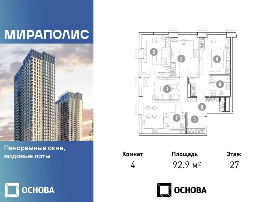 Продаются 4-к апартаменты площадью 92.9 кв.м. на 27-м этаже 33 этажного дома в ЖК "Мираполис" от ГК ОСНОВА. МИРАПОЛИС - проект для тех, кому важно, чтобы под рукой было всё для работы, отдыха и жизни. Проект состоит из четырех башен с авторскими стеклянными фасадами и lounge-rooftop под открытым небом. С высоты птичьего полета резиденты будут наслаждаться видами на город и расположенные рядом парки: "Лосиный остров", "Сокольники", "Ботанический сад", "Сад будущего" и "ВДНХ". МИРАПОЛИС расположен в 3 минутах пешком от МЦК "Ростокино". За 5 минут - можно добраться до ст.м. ВДНХ на машине, а быстрый выезд на главные транспортные магистрали (ТТК и Проспект мира) позволит доехать на личном авто до центра Москвы за полчаса. В просторных лобби с дизайнерской отделкой продуман круглосуточный консьерж-сервис, приватные зоны с мягкой мебелью и комнаты для мытья лап питомцам. Панорамные окна и потолки высотой 3,1 м, а система "умный дом" значительно упростит жизнь резидентам и автоматизирует бытовые процессы. Концептуальный проект предлагает все преимущества бизнес-класса: подземный паркинг, торговый центр и супермаркет, фитнес-клуб, бассейн и SPA, офисы и коворкинги - всё для полноценной и комфортной жизни в столице.О застройщике
