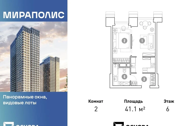 Продаются 2-к апартаменты площадью 41.1 кв.м. на 6-м этаже 33 этажного дома в ЖК "Мираполис" от ГК ОСНОВА. МИРАПОЛИС - проект для тех, кому важно, чтобы под рукой было всё для работы, отдыха и жизни. Проект состоит из четырех башен с авторскими стеклянными фасадами и lounge-rooftop под открытым небом. С высоты птичьего полета резиденты будут наслаждаться видами на город и расположенные рядом парки: "Лосиный остров", "Сокольники", "Ботанический сад", "Сад будущего" и "ВДНХ". МИРАПОЛИС расположен в 3 минутах пешком от МЦК "Ростокино". За 5 минут - можно добраться до ст.м. ВДНХ на машине, а быстрый выезд на главные транспортные магистрали (ТТК и Проспект мира) позволит доехать на личном авто до центра Москвы за полчаса. В просторных лобби с дизайнерской отделкой продуман круглосуточный консьерж-сервис, приватные зоны с мягкой мебелью и комнаты для мытья лап питомцам. Панорамные окна и потолки высотой 3,1 м, а система "умный дом" значительно упростит жизнь резидентам и автоматизирует бытовые процессы. Концептуальный проект предлагает все преимущества бизнес-класса: подземный паркинг, торговый центр и супермаркет, фитнес-клуб, бассейн и SPA, офисы и коворкинги - всё для полноценной и комфортной жизни в столице.О застройщике