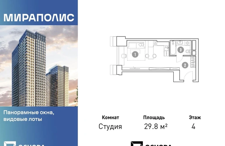 Продается студия площадью 29.8 кв.м. на 4-м этаже 33 этажного дома в ЖК "Мираполис" от ГК ОСНОВА. МИРАПОЛИС - проект для тех, кому важно, чтобы под рукой было всё для работы, отдыха и жизни. Проект состоит из четырех башен с авторскими стеклянными фасадами и lounge-rooftop под открытым небом. С высоты птичьего полета резиденты будут наслаждаться видами на город и расположенные рядом парки: "Лосиный остров", "Сокольники", "Ботанический сад", "Сад будущего" и "ВДНХ". МИРАПОЛИС расположен в 3 минутах пешком от МЦК "Ростокино". За 5 минут - можно добраться до ст.м. ВДНХ на машине, а быстрый выезд на главные транспортные магистрали (ТТК и Проспект мира) позволит доехать на личном авто до центра Москвы за полчаса. В просторных лобби с дизайнерской отделкой продуман круглосуточный консьерж-сервис, приватные зоны с мягкой мебелью и комнаты для мытья лап питомцам. Панорамные окна и потолки высотой 3,1 м, а система "умный дом" значительно упростит жизнь резидентам и автоматизирует бытовые процессы. Концептуальный проект предлагает все преимущества бизнес-класса: подземный паркинг, торговый центр и супермаркет, фитнес-клуб, бассейн и SPA, офисы и коворкинги - всё для полноценной и комфортной жизни в столице.О застройщике