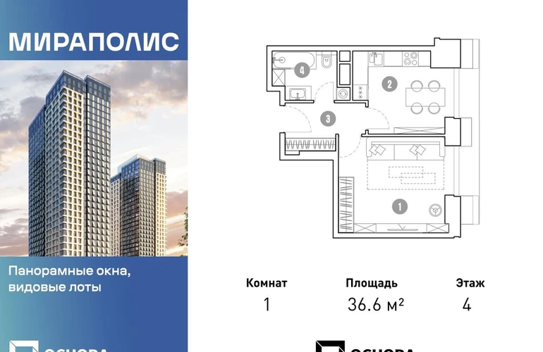 Продаются 1-к апартаменты площадью 36.6 кв.м. на 4-м этаже 33 этажного дома в ЖК "Мираполис" от ГК ОСНОВА. МИРАПОЛИС - проект для тех, кому важно, чтобы под рукой было всё для работы, отдыха и жизни. Проект состоит из четырех башен с авторскими стеклянными фасадами и lounge-rooftop под открытым небом. С высоты птичьего полета резиденты будут наслаждаться видами на город и расположенные рядом парки: "Лосиный остров", "Сокольники", "Ботанический сад", "Сад будущего" и "ВДНХ". МИРАПОЛИС расположен в 3 минутах пешком от МЦК "Ростокино". За 5 минут - можно добраться до ст.м. ВДНХ на машине, а быстрый выезд на главные транспортные магистрали (ТТК и Проспект мира) позволит доехать на личном авто до центра Москвы за полчаса. В просторных лобби с дизайнерской отделкой продуман круглосуточный консьерж-сервис, приватные зоны с мягкой мебелью и комнаты для мытья лап питомцам. Панорамные окна и потолки высотой 3,1 м, а система "умный дом" значительно упростит жизнь резидентам и автоматизирует бытовые процессы. Концептуальный проект предлагает все преимущества бизнес-класса: подземный паркинг, торговый центр и супермаркет, фитнес-клуб, бассейн и SPA, офисы и коворкинги - всё для полноценной и комфортной жизни в столице.О застройщике