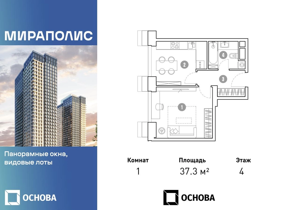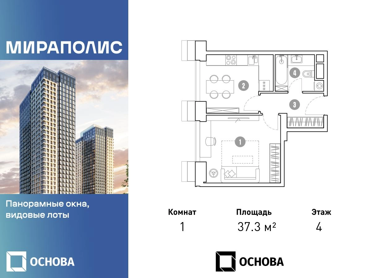 Продаются 1-к апартаменты площадью 37.3 кв.м. на 4-м этаже 33 этажного дома в ЖК "Мираполис" от ГК ОСНОВА. МИРАПОЛИС - проект для тех, кому важно, чтобы под рукой было всё для работы, отдыха и жизни. Проект состоит из четырех башен с авторскими стеклянными фасадами и lounge-rooftop под открытым небом. С высоты птичьего полета резиденты будут наслаждаться видами на город и расположенные рядом парки: "Лосиный остров", "Сокольники", "Ботанический сад", "Сад будущего" и "ВДНХ". МИРАПОЛИС расположен в 3 минутах пешком от МЦК "Ростокино". За 5 минут - можно добраться до ст.м. ВДНХ на машине, а быстрый выезд на главные транспортные магистрали (ТТК и Проспект мира) позволит доехать на личном авто до центра Москвы за полчаса. В просторных лобби с дизайнерской отделкой продуман круглосуточный консьерж-сервис, приватные зоны с мягкой мебелью и комнаты для мытья лап питомцам. Панорамные окна и потолки высотой 3,1 м, а система "умный дом" значительно упростит жизнь резидентам и автоматизирует бытовые процессы. Концептуальный проект предлагает все преимущества бизнес-класса: подземный паркинг, торговый центр и супермаркет, фитнес-клуб, бассейн и SPA, офисы и коворкинги - всё для полноценной и комфортной жизни в столице.О застройщике