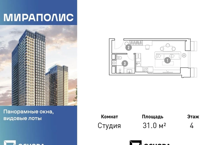 Продается студия площадью 31.0 кв.м. на 4-м этаже 33 этажного дома в ЖК "Мираполис" от ГК ОСНОВА. МИРАПОЛИС - проект для тех, кому важно, чтобы под рукой было всё для работы, отдыха и жизни. Проект состоит из четырех башен с авторскими стеклянными фасадами и lounge-rooftop под открытым небом. С высоты птичьего полета резиденты будут наслаждаться видами на город и расположенные рядом парки: "Лосиный остров", "Сокольники", "Ботанический сад", "Сад будущего" и "ВДНХ". МИРАПОЛИС расположен в 3 минутах пешком от МЦК "Ростокино". За 5 минут - можно добраться до ст.м. ВДНХ на машине, а быстрый выезд на главные транспортные магистрали (ТТК и Проспект мира) позволит доехать на личном авто до центра Москвы за полчаса. В просторных лобби с дизайнерской отделкой продуман круглосуточный консьерж-сервис, приватные зоны с мягкой мебелью и комнаты для мытья лап питомцам. Панорамные окна и потолки высотой 3,1 м, а система "умный дом" значительно упростит жизнь резидентам и автоматизирует бытовые процессы. Концептуальный проект предлагает все преимущества бизнес-класса: подземный паркинг, торговый центр и супермаркет, фитнес-клуб, бассейн и SPA, офисы и коворкинги - всё для полноценной и комфортной жизни в столице.О застройщике