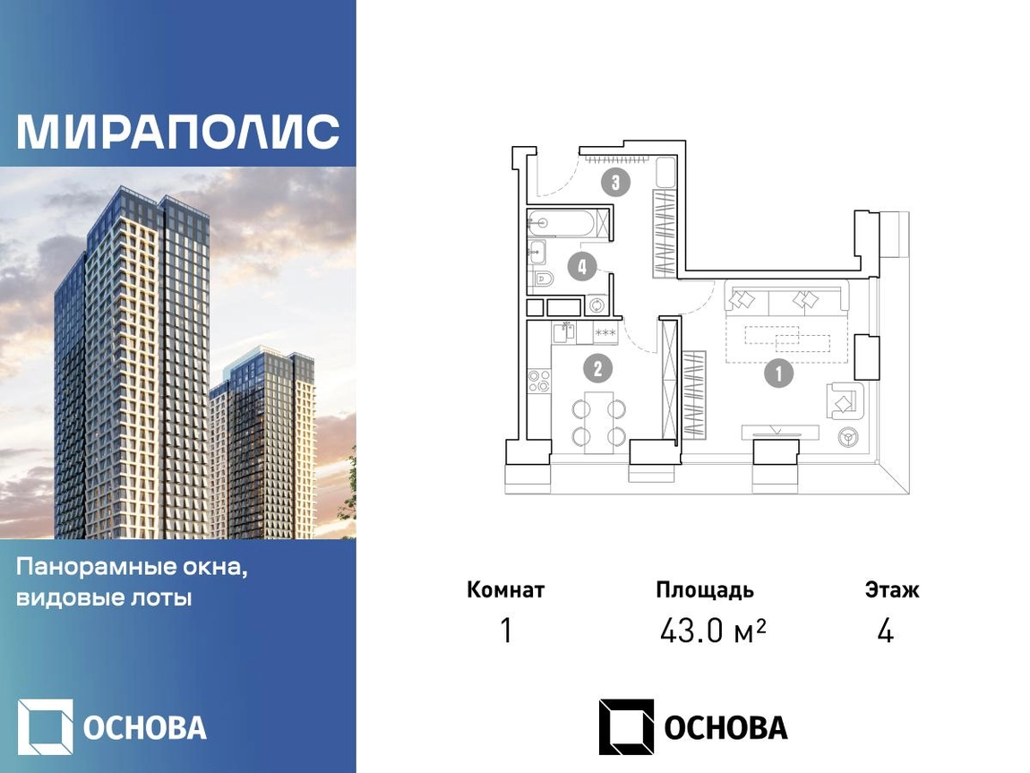 Продаются 1-к апартаменты площадью 43.0 кв.м. на 4-м этаже 33 этажного дома в ЖК "Мираполис" от ГК ОСНОВА. МИРАПОЛИС - проект для тех, кому важно, чтобы под рукой было всё для работы, отдыха и жизни. Проект состоит из четырех башен с авторскими стеклянными фасадами и lounge-rooftop под открытым небом. С высоты птичьего полета резиденты будут наслаждаться видами на город и расположенные рядом парки: "Лосиный остров", "Сокольники", "Ботанический сад", "Сад будущего" и "ВДНХ". МИРАПОЛИС расположен в 3 минутах пешком от МЦК "Ростокино". За 5 минут - можно добраться до ст.м. ВДНХ на машине, а быстрый выезд на главные транспортные магистрали (ТТК и Проспект мира) позволит доехать на личном авто до центра Москвы за полчаса. В просторных лобби с дизайнерской отделкой продуман круглосуточный консьерж-сервис, приватные зоны с мягкой мебелью и комнаты для мытья лап питомцам. Панорамные окна и потолки высотой 3,1 м, а система "умный дом" значительно упростит жизнь резидентам и автоматизирует бытовые процессы. Концептуальный проект предлагает все преимущества бизнес-класса: подземный паркинг, торговый центр и супермаркет, фитнес-клуб, бассейн и SPA, офисы и коворкинги - всё для полноценной и комфортной жизни в столице.О застройщике