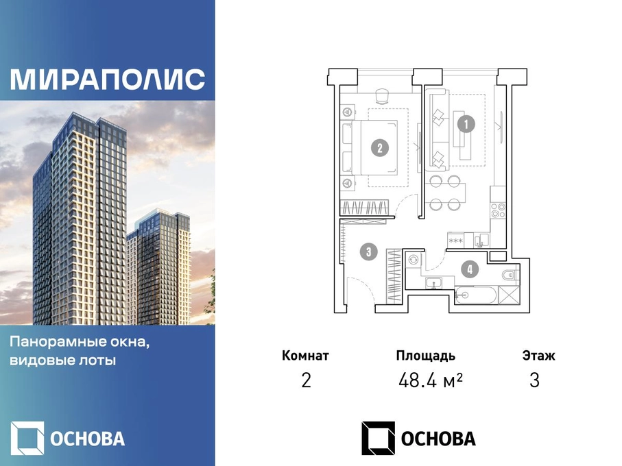 Продаются 2-к апартаменты площадью 48.4 кв.м. на 3-м этаже 33 этажного дома в ЖК "Мираполис" от ГК ОСНОВА. МИРАПОЛИС - проект для тех, кому важно, чтобы под рукой было всё для работы, отдыха и жизни. Проект состоит из четырех башен с авторскими стеклянными фасадами и lounge-rooftop под открытым небом. С высоты птичьего полета резиденты будут наслаждаться видами на город и расположенные рядом парки: "Лосиный остров", "Сокольники", "Ботанический сад", "Сад будущего" и "ВДНХ". МИРАПОЛИС расположен в 3 минутах пешком от МЦК "Ростокино". За 5 минут - можно добраться до ст.м. ВДНХ на машине, а быстрый выезд на главные транспортные магистрали (ТТК и Проспект мира) позволит доехать на личном авто до центра Москвы за полчаса. В просторных лобби с дизайнерской отделкой продуман круглосуточный консьерж-сервис, приватные зоны с мягкой мебелью и комнаты для мытья лап питомцам. Панорамные окна и потолки высотой 3,1 м, а система "умный дом" значительно упростит жизнь резидентам и автоматизирует бытовые процессы. Концептуальный проект предлагает все преимущества бизнес-класса: подземный паркинг, торговый центр и супермаркет, фитнес-клуб, бассейн и SPA, офисы и коворкинги - всё для полноценной и комфортной жизни в столице.О застройщике