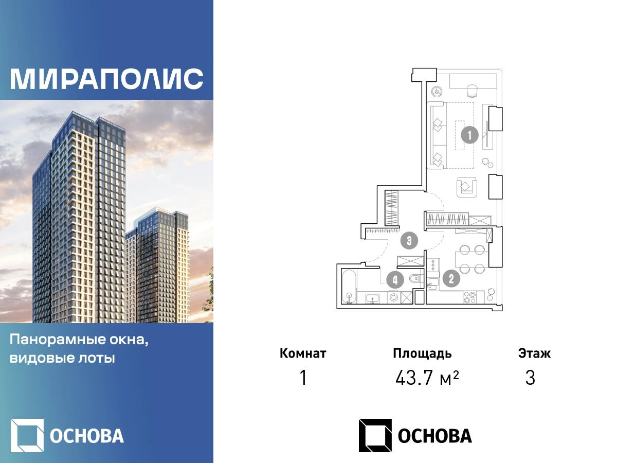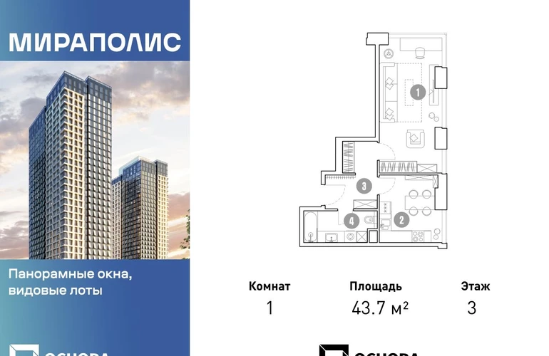 Продаются 1-к апартаменты площадью 43.7 кв.м. на 3-м этаже 33 этажного дома в ЖК "Мираполис" от ГК ОСНОВА. МИРАПОЛИС - проект для тех, кому важно, чтобы под рукой было всё для работы, отдыха и жизни. Проект состоит из четырех башен с авторскими стеклянными фасадами и lounge-rooftop под открытым небом. С высоты птичьего полета резиденты будут наслаждаться видами на город и расположенные рядом парки: "Лосиный остров", "Сокольники", "Ботанический сад", "Сад будущего" и "ВДНХ". МИРАПОЛИС расположен в 3 минутах пешком от МЦК "Ростокино". За 5 минут - можно добраться до ст.м. ВДНХ на машине, а быстрый выезд на главные транспортные магистрали (ТТК и Проспект мира) позволит доехать на личном авто до центра Москвы за полчаса. В просторных лобби с дизайнерской отделкой продуман круглосуточный консьерж-сервис, приватные зоны с мягкой мебелью и комнаты для мытья лап питомцам. Панорамные окна и потолки высотой 3,1 м, а система "умный дом" значительно упростит жизнь резидентам и автоматизирует бытовые процессы. Концептуальный проект предлагает все преимущества бизнес-класса: подземный паркинг, торговый центр и супермаркет, фитнес-клуб, бассейн и SPA, офисы и коворкинги - всё для полноценной и комфортной жизни в столице.О застройщике
