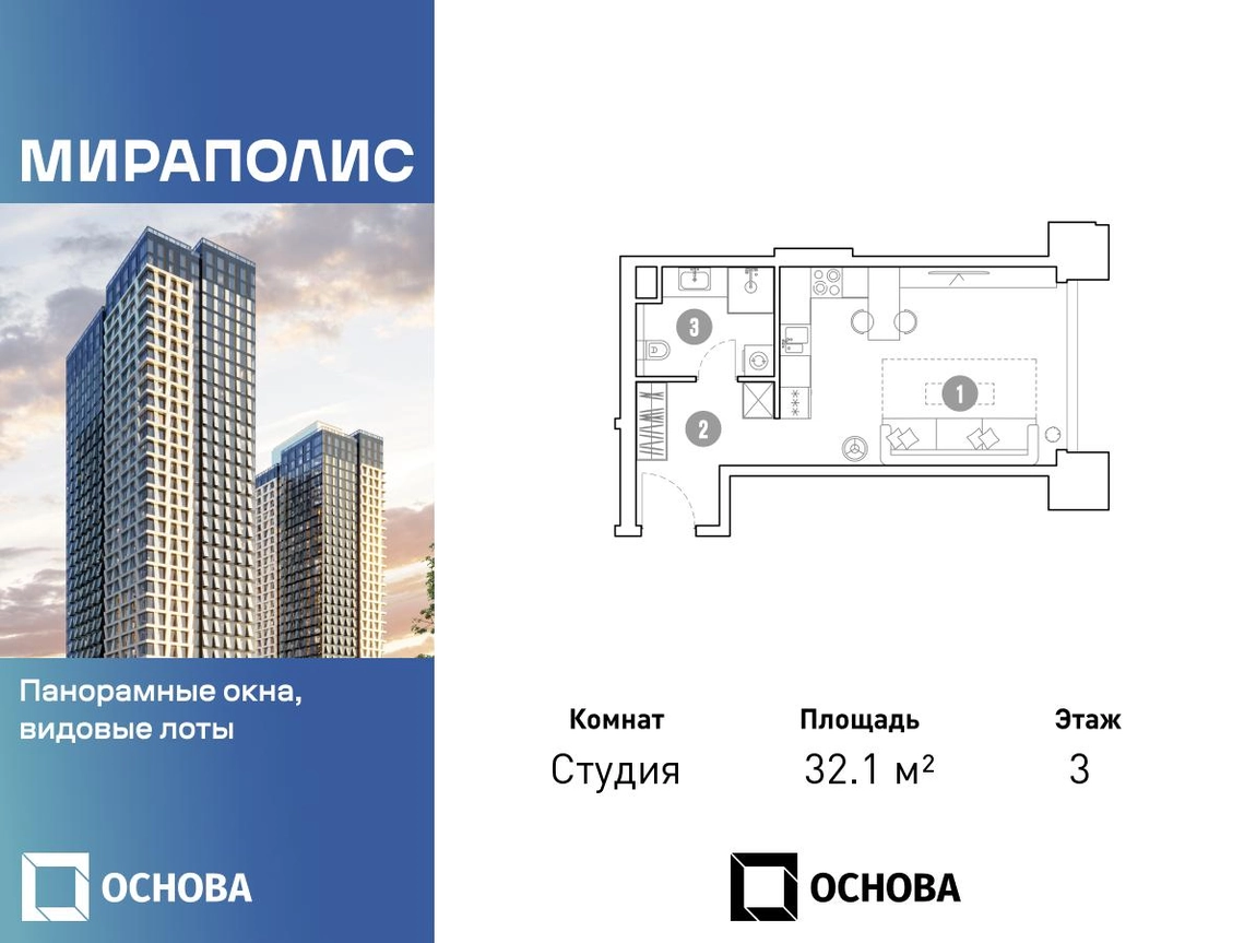 Продается студия площадью 32.1 кв.м. на 3-м этаже 33 этажного дома в ЖК "Мираполис" от ГК ОСНОВА. МИРАПОЛИС - проект для тех, кому важно, чтобы под рукой было всё для работы, отдыха и жизни. Проект состоит из четырех башен с авторскими стеклянными фасадами и lounge-rooftop под открытым небом. С высоты птичьего полета резиденты будут наслаждаться видами на город и расположенные рядом парки: "Лосиный остров", "Сокольники", "Ботанический сад", "Сад будущего" и "ВДНХ". МИРАПОЛИС расположен в 3 минутах пешком от МЦК "Ростокино". За 5 минут - можно добраться до ст.м. ВДНХ на машине, а быстрый выезд на главные транспортные магистрали (ТТК и Проспект мира) позволит доехать на личном авто до центра Москвы за полчаса. В просторных лобби с дизайнерской отделкой продуман круглосуточный консьерж-сервис, приватные зоны с мягкой мебелью и комнаты для мытья лап питомцам. Панорамные окна и потолки высотой 3,1 м, а система "умный дом" значительно упростит жизнь резидентам и автоматизирует бытовые процессы. Концептуальный проект предлагает все преимущества бизнес-класса: подземный паркинг, торговый центр и супермаркет, фитнес-клуб, бассейн и SPA, офисы и коворкинги - всё для полноценной и комфортной жизни в столице.О застройщике