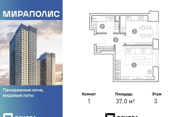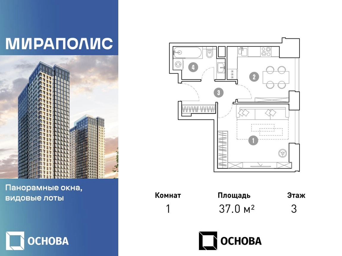 Продаются 1-к апартаменты площадью 37.0 кв.м. на 3-м этаже 33 этажного дома в ЖК "Мираполис" от ГК ОСНОВА. МИРАПОЛИС - проект для тех, кому важно, чтобы под рукой было всё для работы, отдыха и жизни. Проект состоит из четырех башен с авторскими стеклянными фасадами и lounge-rooftop под открытым небом. С высоты птичьего полета резиденты будут наслаждаться видами на город и расположенные рядом парки: "Лосиный остров", "Сокольники", "Ботанический сад", "Сад будущего" и "ВДНХ". МИРАПОЛИС расположен в 3 минутах пешком от МЦК "Ростокино". За 5 минут - можно добраться до ст.м. ВДНХ на машине, а быстрый выезд на главные транспортные магистрали (ТТК и Проспект мира) позволит доехать на личном авто до центра Москвы за полчаса. В просторных лобби с дизайнерской отделкой продуман круглосуточный консьерж-сервис, приватные зоны с мягкой мебелью и комнаты для мытья лап питомцам. Панорамные окна и потолки высотой 3,1 м, а система "умный дом" значительно упростит жизнь резидентам и автоматизирует бытовые процессы. Концептуальный проект предлагает все преимущества бизнес-класса: подземный паркинг, торговый центр и супермаркет, фитнес-клуб, бассейн и SPA, офисы и коворкинги - всё для полноценной и комфортной жизни в столице.О застройщике