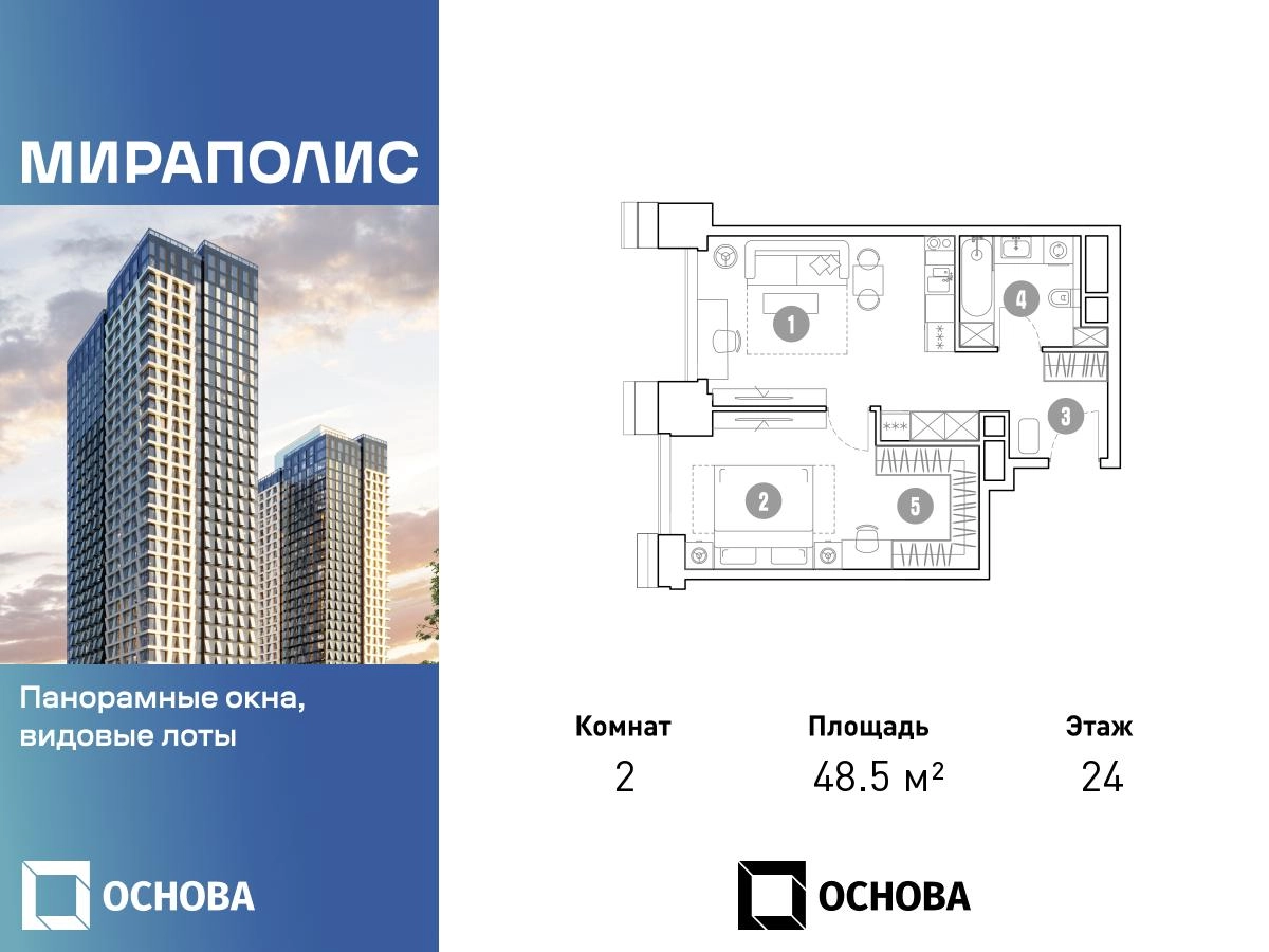 Продаются 2-к апартаменты площадью 48.5 кв.м. на 24-м этаже 33 этажного дома в ЖК "Мираполис" от ГК ОСНОВА. МИРАПОЛИС - проект для тех, кому важно, чтобы под рукой было всё для работы, отдыха и жизни. Проект состоит из четырех башен с авторскими стеклянными фасадами и lounge-rooftop под открытым небом. С высоты птичьего полета резиденты будут наслаждаться видами на город и расположенные рядом парки: "Лосиный остров", "Сокольники", "Ботанический сад", "Сад будущего" и "ВДНХ". МИРАПОЛИС расположен в 3 минутах пешком от МЦК "Ростокино". За 5 минут - можно добраться до ст.м. ВДНХ на машине, а быстрый выезд на главные транспортные магистрали (ТТК и Проспект мира) позволит доехать на личном авто до центра Москвы за полчаса. В просторных лобби с дизайнерской отделкой продуман круглосуточный консьерж-сервис, приватные зоны с мягкой мебелью и комнаты для мытья лап питомцам. Панорамные окна и потолки высотой 3,1 м, а система "умный дом" значительно упростит жизнь резидентам и автоматизирует бытовые процессы. Концептуальный проект предлагает все преимущества бизнес-класса: подземный паркинг, торговый центр и супермаркет, фитнес-клуб, бассейн и SPA, офисы и коворкинги - всё для полноценной и комфортной жизни в столице.О застройщике