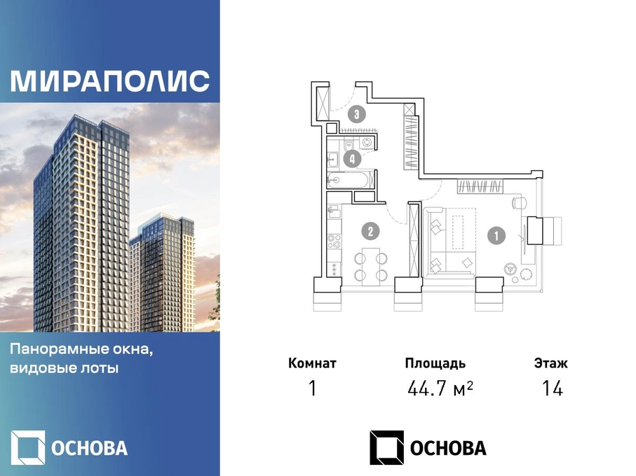 Продаются 1-к апартаменты площадью 44.7 кв.м. на 14-м этаже 33 этажного дома в ЖК "Мираполис" от ГК ОСНОВА. МИРАПОЛИС - проект для тех, кому важно, чтобы под рукой было всё для работы, отдыха и жизни. Проект состоит из четырех башен с авторскими стеклянными фасадами и lounge-rooftop под открытым небом. С высоты птичьего полета резиденты будут наслаждаться видами на город и расположенные рядом парки: "Лосиный остров", "Сокольники", "Ботанический сад", "Сад будущего" и "ВДНХ". МИРАПОЛИС расположен в 3 минутах пешком от МЦК "Ростокино". За 5 минут - можно добраться до ст.м. ВДНХ на машине, а быстрый выезд на главные транспортные магистрали (ТТК и Проспект мира) позволит доехать на личном авто до центра Москвы за полчаса. В просторных лобби с дизайнерской отделкой продуман круглосуточный консьерж-сервис, приватные зоны с мягкой мебелью и комнаты для мытья лап питомцам. Панорамные окна и потолки высотой 3,1 м, а система "умный дом" значительно упростит жизнь резидентам и автоматизирует бытовые процессы. Концептуальный проект предлагает все преимущества бизнес-класса: подземный паркинг, торговый центр и супермаркет, фитнес-клуб, бассейн и SPA, офисы и коворкинги - всё для полноценной и комфортной жизни в столице.О застройщике