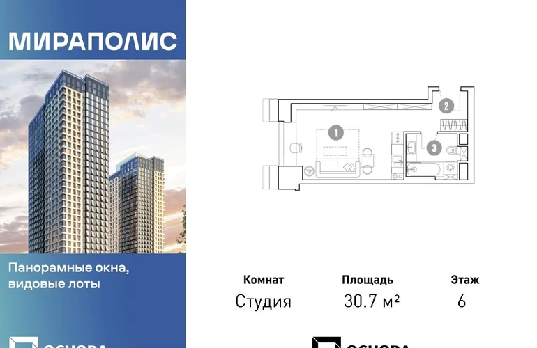 Продается студия площадью 30.7 кв.м. на 6-м этаже 33 этажного дома в ЖК "Мираполис" от ГК ОСНОВА. МИРАПОЛИС - проект для тех, кому важно, чтобы под рукой было всё для работы, отдыха и жизни. Проект состоит из четырех башен с авторскими стеклянными фасадами и lounge-rooftop под открытым небом. С высоты птичьего полета резиденты будут наслаждаться видами на город и расположенные рядом парки: "Лосиный остров", "Сокольники", "Ботанический сад", "Сад будущего" и "ВДНХ". МИРАПОЛИС расположен в 3 минутах пешком от МЦК "Ростокино". За 5 минут - можно добраться до ст.м. ВДНХ на машине, а быстрый выезд на главные транспортные магистрали (ТТК и Проспект мира) позволит доехать на личном авто до центра Москвы за полчаса. В просторных лобби с дизайнерской отделкой продуман круглосуточный консьерж-сервис, приватные зоны с мягкой мебелью и комнаты для мытья лап питомцам. Панорамные окна и потолки высотой 3,1 м, а система "умный дом" значительно упростит жизнь резидентам и автоматизирует бытовые процессы. Концептуальный проект предлагает все преимущества бизнес-класса: подземный паркинг, торговый центр и супермаркет, фитнес-клуб, бассейн и SPA, офисы и коворкинги - всё для полноценной и комфортной жизни в столице.О застройщике