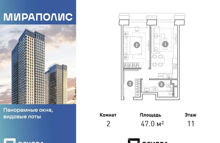 Продаются 2-к апартаменты площадью 47.0 кв.м. на 11-м этаже 33 этажного дома в ЖК "Мираполис" от ГК ОСНОВА. МИРАПОЛИС - проект для тех, кому важно, чтобы под рукой было всё для работы, отдыха и жизни. Проект состоит из четырех башен с авторскими стеклянными фасадами и lounge-rooftop под открытым небом. С высоты птичьего полета резиденты будут наслаждаться видами на город и расположенные рядом парки: "Лосиный остров", "Сокольники", "Ботанический сад", "Сад будущего" и "ВДНХ". МИРАПОЛИС расположен в 3 минутах пешком от МЦК "Ростокино". За 5 минут - можно добраться до ст.м. ВДНХ на машине, а быстрый выезд на главные транспортные магистрали (ТТК и Проспект мира) позволит доехать на личном авто до центра Москвы за полчаса. В просторных лобби с дизайнерской отделкой продуман круглосуточный консьерж-сервис, приватные зоны с мягкой мебелью и комнаты для мытья лап питомцам. Панорамные окна и потолки высотой 3,1 м, а система "умный дом" значительно упростит жизнь резидентам и автоматизирует бытовые процессы. Концептуальный проект предлагает все преимущества бизнес-класса: подземный паркинг, торговый центр и супермаркет, фитнес-клуб, бассейн и SPA, офисы и коворкинги - всё для полноценной и комфортной жизни в столице.О застройщике