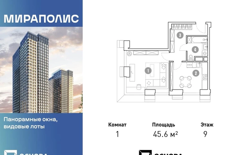 Продаются 1-к апартаменты площадью 45.6 кв.м. на 9-м этаже 33 этажного дома в ЖК "Мираполис" от ГК ОСНОВА. МИРАПОЛИС - проект для тех, кому важно, чтобы под рукой было всё для работы, отдыха и жизни. Проект состоит из четырех башен с авторскими стеклянными фасадами и lounge-rooftop под открытым небом. С высоты птичьего полета резиденты будут наслаждаться видами на город и расположенные рядом парки: "Лосиный остров", "Сокольники", "Ботанический сад", "Сад будущего" и "ВДНХ". МИРАПОЛИС расположен в 3 минутах пешком от МЦК "Ростокино". За 5 минут - можно добраться до ст.м. ВДНХ на машине, а быстрый выезд на главные транспортные магистрали (ТТК и Проспект мира) позволит доехать на личном авто до центра Москвы за полчаса. В просторных лобби с дизайнерской отделкой продуман круглосуточный консьерж-сервис, приватные зоны с мягкой мебелью и комнаты для мытья лап питомцам. Панорамные окна и потолки высотой 3,1 м, а система "умный дом" значительно упростит жизнь резидентам и автоматизирует бытовые процессы. Концептуальный проект предлагает все преимущества бизнес-класса: подземный паркинг, торговый центр и супермаркет, фитнес-клуб, бассейн и SPA, офисы и коворкинги - всё для полноценной и комфортной жизни в столице.О застройщике