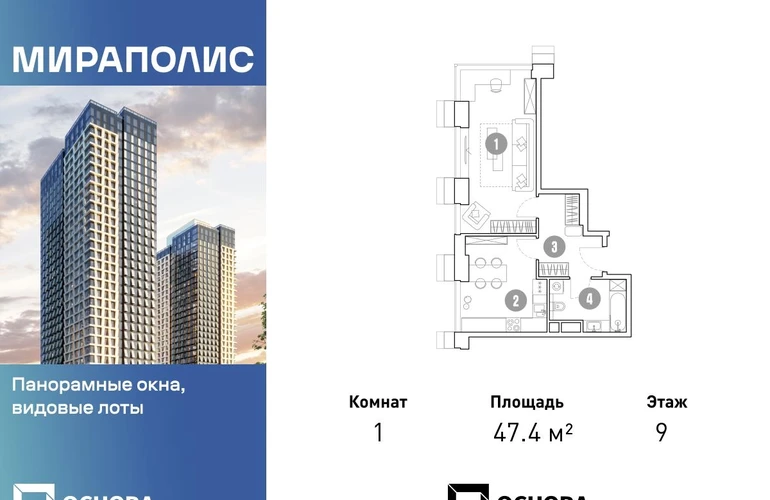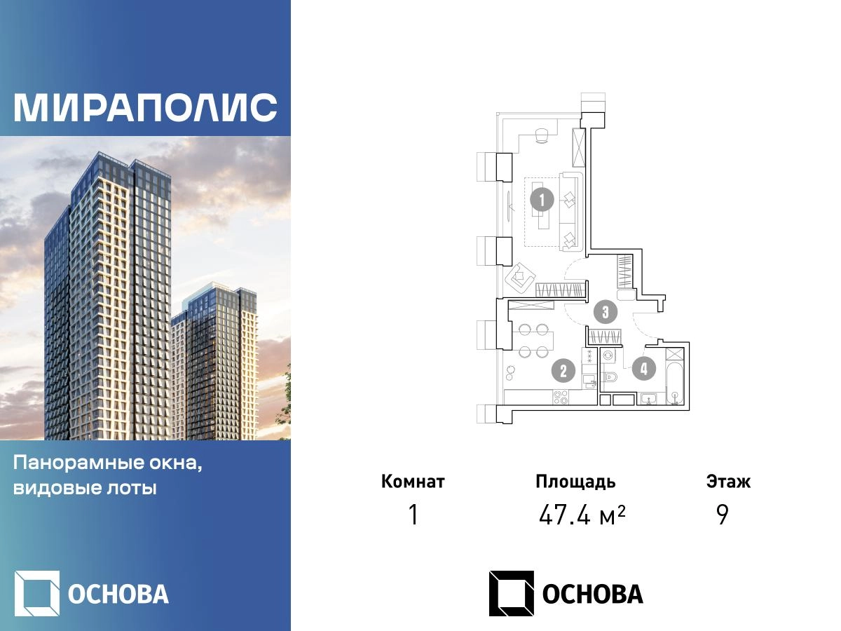 Продаются 1-к апартаменты площадью 47.4 кв.м. на 9-м этаже 33 этажного дома в ЖК "Мираполис" от ГК ОСНОВА. МИРАПОЛИС - проект для тех, кому важно, чтобы под рукой было всё для работы, отдыха и жизни. Проект состоит из четырех башен с авторскими стеклянными фасадами и lounge-rooftop под открытым небом. С высоты птичьего полета резиденты будут наслаждаться видами на город и расположенные рядом парки: "Лосиный остров", "Сокольники", "Ботанический сад", "Сад будущего" и "ВДНХ". МИРАПОЛИС расположен в 3 минутах пешком от МЦК "Ростокино". За 5 минут - можно добраться до ст.м. ВДНХ на машине, а быстрый выезд на главные транспортные магистрали (ТТК и Проспект мира) позволит доехать на личном авто до центра Москвы за полчаса. В просторных лобби с дизайнерской отделкой продуман круглосуточный консьерж-сервис, приватные зоны с мягкой мебелью и комнаты для мытья лап питомцам. Панорамные окна и потолки высотой 3,1 м, а система "умный дом" значительно упростит жизнь резидентам и автоматизирует бытовые процессы. Концептуальный проект предлагает все преимущества бизнес-класса: подземный паркинг, торговый центр и супермаркет, фитнес-клуб, бассейн и SPA, офисы и коворкинги - всё для полноценной и комфортной жизни в столице.О застройщике