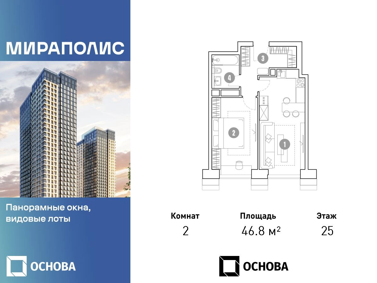 Продаются 2-к апартаменты площадью 46.8 кв.м. на 25-м этаже 33 этажного дома в ЖК "Мираполис" от ГК ОСНОВА. МИРАПОЛИС - проект для тех, кому важно, чтобы под рукой было всё для работы, отдыха и жизни. Проект состоит из четырех башен с авторскими стеклянными фасадами и lounge-rooftop под открытым небом. С высоты птичьего полета резиденты будут наслаждаться видами на город и расположенные рядом парки: "Лосиный остров", "Сокольники", "Ботанический сад", "Сад будущего" и "ВДНХ". МИРАПОЛИС расположен в 3 минутах пешком от МЦК "Ростокино". За 5 минут - можно добраться до ст.м. ВДНХ на машине, а быстрый выезд на главные транспортные магистрали (ТТК и Проспект мира) позволит доехать на личном авто до центра Москвы за полчаса. В просторных лобби с дизайнерской отделкой продуман круглосуточный консьерж-сервис, приватные зоны с мягкой мебелью и комнаты для мытья лап питомцам. Панорамные окна и потолки высотой 3,1 м, а система "умный дом" значительно упростит жизнь резидентам и автоматизирует бытовые процессы. Концептуальный проект предлагает все преимущества бизнес-класса: подземный паркинг, торговый центр и супермаркет, фитнес-клуб, бассейн и SPA, офисы и коворкинги - всё для полноценной и комфортной жизни в столице.О застройщике