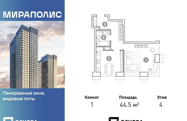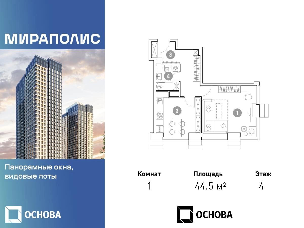 Продаются 1-к апартаменты площадью 44.5 кв.м. на 4-м этаже 33 этажного дома в ЖК "Мираполис" от ГК ОСНОВА. МИРАПОЛИС - проект для тех, кому важно, чтобы под рукой было всё для работы, отдыха и жизни. Проект состоит из четырех башен с авторскими стеклянными фасадами и lounge-rooftop под открытым небом. С высоты птичьего полета резиденты будут наслаждаться видами на город и расположенные рядом парки: "Лосиный остров", "Сокольники", "Ботанический сад", "Сад будущего" и "ВДНХ". МИРАПОЛИС расположен в 3 минутах пешком от МЦК "Ростокино". За 5 минут - можно добраться до ст.м. ВДНХ на машине, а быстрый выезд на главные транспортные магистрали (ТТК и Проспект мира) позволит доехать на личном авто до центра Москвы за полчаса. В просторных лобби с дизайнерской отделкой продуман круглосуточный консьерж-сервис, приватные зоны с мягкой мебелью и комнаты для мытья лап питомцам. Панорамные окна и потолки высотой 3,1 м, а система "умный дом" значительно упростит жизнь резидентам и автоматизирует бытовые процессы. Концептуальный проект предлагает все преимущества бизнес-класса: подземный паркинг, торговый центр и супермаркет, фитнес-клуб, бассейн и SPA, офисы и коворкинги - всё для полноценной и комфортной жизни в столице.О застройщике