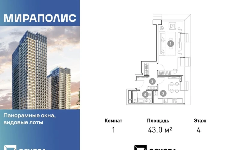 Продаются 1-к апартаменты площадью 43.0 кв.м. на 4-м этаже 33 этажного дома в ЖК "Мираполис" от ГК ОСНОВА. МИРАПОЛИС - проект для тех, кому важно, чтобы под рукой было всё для работы, отдыха и жизни. Проект состоит из четырех башен с авторскими стеклянными фасадами и lounge-rooftop под открытым небом. С высоты птичьего полета резиденты будут наслаждаться видами на город и расположенные рядом парки: "Лосиный остров", "Сокольники", "Ботанический сад", "Сад будущего" и "ВДНХ". МИРАПОЛИС расположен в 3 минутах пешком от МЦК "Ростокино". За 5 минут - можно добраться до ст.м. ВДНХ на машине, а быстрый выезд на главные транспортные магистрали (ТТК и Проспект мира) позволит доехать на личном авто до центра Москвы за полчаса. В просторных лобби с дизайнерской отделкой продуман круглосуточный консьерж-сервис, приватные зоны с мягкой мебелью и комнаты для мытья лап питомцам. Панорамные окна и потолки высотой 3,1 м, а система "умный дом" значительно упростит жизнь резидентам и автоматизирует бытовые процессы. Концептуальный проект предлагает все преимущества бизнес-класса: подземный паркинг, торговый центр и супермаркет, фитнес-клуб, бассейн и SPA, офисы и коворкинги - всё для полноценной и комфортной жизни в столице.
