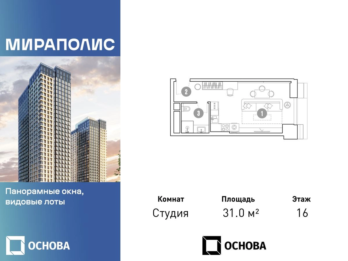Продается студия площадью 31.0 кв.м. на 16-м этаже 33 этажного дома в ЖК "Мираполис" от ГК ОСНОВА. МИРАПОЛИС - проект для тех, кому важно, чтобы под рукой было всё для работы, отдыха и жизни. Проект состоит из четырех башен с авторскими стеклянными фасадами и lounge-rooftop под открытым небом. С высоты птичьего полета резиденты будут наслаждаться видами на город и расположенные рядом парки: "Лосиный остров", "Сокольники", "Ботанический сад", "Сад будущего" и "ВДНХ". МИРАПОЛИС расположен в 3 минутах пешком от МЦК "Ростокино". За 5 минут - можно добраться до ст.м. ВДНХ на машине, а быстрый выезд на главные транспортные магистрали (ТТК и Проспект мира) позволит доехать на личном авто до центра Москвы за полчаса. В просторных лобби с дизайнерской отделкой продуман круглосуточный консьерж-сервис, приватные зоны с мягкой мебелью и комнаты для мытья лап питомцам. Панорамные окна и потолки высотой 3,1 м, а система "умный дом" значительно упростит жизнь резидентам и автоматизирует бытовые процессы. Концептуальный проект предлагает все преимущества бизнес-класса: подземный паркинг, торговый центр и супермаркет, фитнес-клуб, бассейн и SPA, офисы и коворкинги - всё для полноценной и комфортной жизни в столице.О застройщике