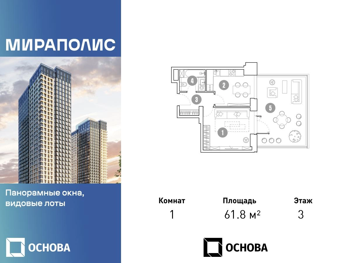 Продаются 1-к апартаменты площадью 61.8 кв.м. на 3-м этаже 33 этажного дома в ЖК "Мираполис" от ГК ОСНОВА. МИРАПОЛИС - проект для тех, кому важно, чтобы под рукой было всё для работы, отдыха и жизни. Проект состоит из четырех башен с авторскими стеклянными фасадами и lounge-rooftop под открытым небом. С высоты птичьего полета резиденты будут наслаждаться видами на город и расположенные рядом парки: "Лосиный остров", "Сокольники", "Ботанический сад", "Сад будущего" и "ВДНХ". МИРАПОЛИС расположен в 3 минутах пешком от МЦК "Ростокино". За 5 минут - можно добраться до ст.м. ВДНХ на машине, а быстрый выезд на главные транспортные магистрали (ТТК и Проспект мира) позволит доехать на личном авто до центра Москвы за полчаса. В просторных лобби с дизайнерской отделкой продуман круглосуточный консьерж-сервис, приватные зоны с мягкой мебелью и комнаты для мытья лап питомцам. Панорамные окна и потолки высотой 3,1 м, а система "умный дом" значительно упростит жизнь резидентам и автоматизирует бытовые процессы. Концептуальный проект предлагает все преимущества бизнес-класса: подземный паркинг, торговый центр и супермаркет, фитнес-клуб, бассейн и SPA, офисы и коворкинги - всё для полноценной и комфортной жизни в столице.О застройщике