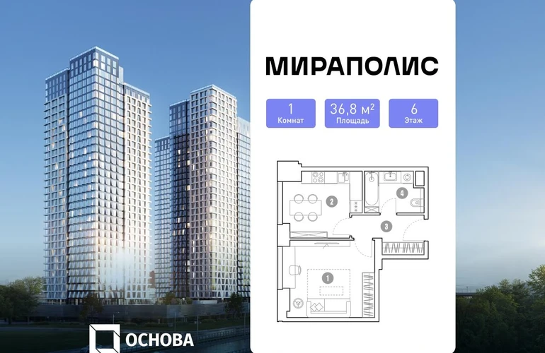 Продаются 1-к апартаменты площадью 36.8 кв.м. на 6-м этаже 33 этажного дома в ЖК "Мираполис" от ГК ОСНОВА. МИРАПОЛИС - проект для тех, кому важно, чтобы под рукой было всё для работы, отдыха и жизни. Проект состоит из четырех башен с авторскими стеклянными фасадами и lounge-rooftop под открытым небом. С высоты птичьего полета резиденты будут наслаждаться видами на город и расположенные рядом парки: "Лосиный остров", "Сокольники", "Ботанический сад", "Сад будущего" и "ВДНХ". МИРАПОЛИС расположен в 3 минутах пешком от МЦК "Ростокино". За 5 минут - можно добраться до ст.м. ВДНХ на машине, а быстрый выезд на главные транспортные магистрали (ТТК и Проспект мира) позволит доехать на личном авто до центра Москвы за полчаса. В просторных лобби с дизайнерской отделкой продуман круглосуточный консьерж-сервис, приватные зоны с мягкой мебелью и комнаты для мытья лап питомцам. Панорамные окна и потолки высотой 3,1 м, а система "умный дом" значительно упростит жизнь резидентам и автоматизирует бытовые процессы. Концептуальный проект предлагает все преимущества бизнес-класса: подземный паркинг, торговый центр и супермаркет, фитнес-клуб, бассейн и SPA, офисы и коворкинги - всё для полноценной и комфортной жизни в столице.О застройщике