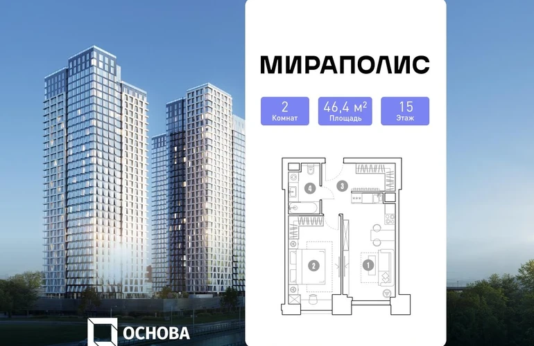 Продаются 2-к апартаменты площадью 46.4 кв.м. на 15-м этаже 33 этажного дома в ЖК "Мираполис" от ГК ОСНОВА. МИРАПОЛИС - проект для тех, кому важно, чтобы под рукой было всё для работы, отдыха и жизни. Проект состоит из четырех башен с авторскими стеклянными фасадами и lounge-rooftop под открытым небом. С высоты птичьего полета резиденты будут наслаждаться видами на город и расположенные рядом парки: "Лосиный остров", "Сокольники", "Ботанический сад", "Сад будущего" и "ВДНХ". МИРАПОЛИС расположен в 3 минутах пешком от МЦК "Ростокино". За 5 минут - можно добраться до ст.м. ВДНХ на машине, а быстрый выезд на главные транспортные магистрали (ТТК и Проспект мира) позволит доехать на личном авто до центра Москвы за полчаса. В просторных лобби с дизайнерской отделкой продуман круглосуточный консьерж-сервис, приватные зоны с мягкой мебелью и комнаты для мытья лап питомцам. Панорамные окна и потолки высотой 3,1 м, а система "умный дом" значительно упростит жизнь резидентам и автоматизирует бытовые процессы. Концептуальный проект предлагает все преимущества бизнес-класса: подземный паркинг, торговый центр и супермаркет, фитнес-клуб, бассейн и SPA, офисы и коворкинги - всё для полноценной и комфортной жизни в столице.О застройщике