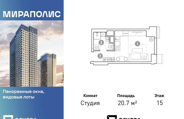 Продается студия площадью 20.7 кв.м. на 15-м этаже 33 этажного дома в ЖК "Мираполис" от ГК ОСНОВА. МИРАПОЛИС - проект для тех, кому важно, чтобы под рукой было всё для работы, отдыха и жизни. Проект состоит из четырех башен с авторскими стеклянными фасадами и lounge-rooftop под открытым небом. С высоты птичьего полета резиденты будут наслаждаться видами на город и расположенные рядом парки: "Лосиный остров", "Сокольники", "Ботанический сад", "Сад будущего" и "ВДНХ". МИРАПОЛИС расположен в 3 минутах пешком от МЦК "Ростокино". За 5 минут - можно добраться до ст.м. ВДНХ на машине, а быстрый выезд на главные транспортные магистрали (ТТК и Проспект мира) позволит доехать на личном авто до центра Москвы за полчаса. В просторных лобби с дизайнерской отделкой продуман круглосуточный консьерж-сервис, приватные зоны с мягкой мебелью и комнаты для мытья лап питомцам. Панорамные окна и потолки высотой 3,1 м, а система "умный дом" значительно упростит жизнь резидентам и автоматизирует бытовые процессы. Концептуальный проект предлагает все преимущества бизнес-класса: подземный паркинг, торговый центр и супермаркет, фитнес-клуб, бассейн и SPA, офисы и коворкинги - всё для полноценной и комфортной жизни в столице.О застройщике