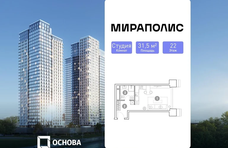 Продается студия площадью 31.5 кв.м. на 22-м этаже 33 этажного дома в ЖК "Мираполис" от ГК ОСНОВА. МИРАПОЛИС - проект для тех, кому важно, чтобы под рукой было всё для работы, отдыха и жизни. Проект состоит из четырех башен с авторскими стеклянными фасадами и lounge-rooftop под открытым небом. С высоты птичьего полета резиденты будут наслаждаться видами на город и расположенные рядом парки: "Лосиный остров", "Сокольники", "Ботанический сад", "Сад будущего" и "ВДНХ". МИРАПОЛИС расположен в 3 минутах пешком от МЦК "Ростокино". За 5 минут - можно добраться до ст.м. ВДНХ на машине, а быстрый выезд на главные транспортные магистрали (ТТК и Проспект мира) позволит доехать на личном авто до центра Москвы за полчаса. В просторных лобби с дизайнерской отделкой продуман круглосуточный консьерж-сервис, приватные зоны с мягкой мебелью и комнаты для мытья лап питомцам. Панорамные окна и потолки высотой 3,1 м, а система "умный дом" значительно упростит жизнь резидентам и автоматизирует бытовые процессы. Концептуальный проект предлагает все преимущества бизнес-класса: подземный паркинг, торговый центр и супермаркет, фитнес-клуб, бассейн и SPA, офисы и коворкинги - всё для полноценной и комфортной жизни в столице.О застройщике