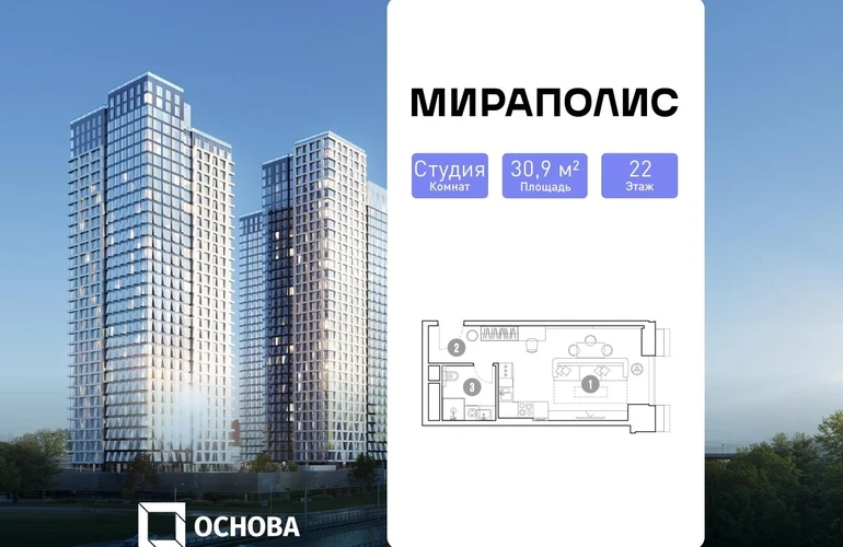 Продается студия площадью 30.9 кв.м. на 22-м этаже 33 этажного дома в ЖК "Мираполис" от ГК ОСНОВА. МИРАПОЛИС - проект для тех, кому важно, чтобы под рукой было всё для работы, отдыха и жизни. Проект состоит из четырех башен с авторскими стеклянными фасадами и lounge-rooftop под открытым небом. С высоты птичьего полета резиденты будут наслаждаться видами на город и расположенные рядом парки: "Лосиный остров", "Сокольники", "Ботанический сад", "Сад будущего" и "ВДНХ". МИРАПОЛИС расположен в 3 минутах пешком от МЦК "Ростокино". За 5 минут - можно добраться до ст.м. ВДНХ на машине, а быстрый выезд на главные транспортные магистрали (ТТК и Проспект мира) позволит доехать на личном авто до центра Москвы за полчаса. В просторных лобби с дизайнерской отделкой продуман круглосуточный консьерж-сервис, приватные зоны с мягкой мебелью и комнаты для мытья лап питомцам. Панорамные окна и потолки высотой 3,1 м, а система "умный дом" значительно упростит жизнь резидентам и автоматизирует бытовые процессы. Концептуальный проект предлагает все преимущества бизнес-класса: подземный паркинг, торговый центр и супермаркет, фитнес-клуб, бассейн и SPA, офисы и коворкинги - всё для полноценной и комфортной жизни в столице.О застройщике