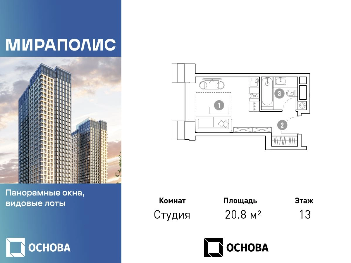 Продается студия площадью 20.8 кв.м. на 13-м этаже 33 этажного дома в ЖК "Мираполис" от ГК ОСНОВА. МИРАПОЛИС - проект для тех, кому важно, чтобы под рукой было всё для работы, отдыха и жизни. Проект состоит из четырех башен с авторскими стеклянными фасадами и lounge-rooftop под открытым небом. С высоты птичьего полета резиденты будут наслаждаться видами на город и расположенные рядом парки: "Лосиный остров", "Сокольники", "Ботанический сад", "Сад будущего" и "ВДНХ". МИРАПОЛИС расположен в 3 минутах пешком от МЦК "Ростокино". За 5 минут - можно добраться до ст.м. ВДНХ на машине, а быстрый выезд на главные транспортные магистрали (ТТК и Проспект мира) позволит доехать на личном авто до центра Москвы за полчаса. В просторных лобби с дизайнерской отделкой продуман круглосуточный консьерж-сервис, приватные зоны с мягкой мебелью и комнаты для мытья лап питомцам. Панорамные окна и потолки высотой 3,1 м, а система "умный дом" значительно упростит жизнь резидентам и автоматизирует бытовые процессы. Концептуальный проект предлагает все преимущества бизнес-класса: подземный паркинг, торговый центр и супермаркет, фитнес-клуб, бассейн и SPA, офисы и коворкинги - всё для полноценной и комфортной жизни в столице.О застройщике
