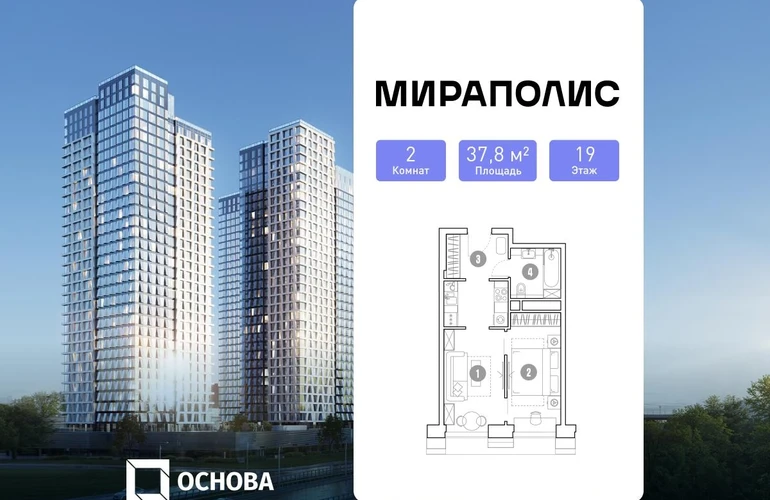 Продаются 2-к апартаменты площадью 37.8 кв.м. на 19-м этаже 33 этажного дома в ЖК "Мираполис" от ГК ОСНОВА. МИРАПОЛИС - проект для тех, кому важно, чтобы под рукой было всё для работы, отдыха и жизни. Проект состоит из четырех башен с авторскими стеклянными фасадами и lounge-rooftop под открытым небом. С высоты птичьего полета резиденты будут наслаждаться видами на город и расположенные рядом парки: "Лосиный остров", "Сокольники", "Ботанический сад", "Сад будущего" и "ВДНХ". МИРАПОЛИС расположен в 3 минутах пешком от МЦК "Ростокино". За 5 минут - можно добраться до ст.м. ВДНХ на машине, а быстрый выезд на главные транспортные магистрали (ТТК и Проспект мира) позволит доехать на личном авто до центра Москвы за полчаса. В просторных лобби с дизайнерской отделкой продуман круглосуточный консьерж-сервис, приватные зоны с мягкой мебелью и комнаты для мытья лап питомцам. Панорамные окна и потолки высотой 3,1 м, а система "умный дом" значительно упростит жизнь резидентам и автоматизирует бытовые процессы. Концептуальный проект предлагает все преимущества бизнес-класса: подземный паркинг, торговый центр и супермаркет, фитнес-клуб, бассейн и SPA, офисы и коворкинги - всё для полноценной и комфортной жизни в столице.О застройщике