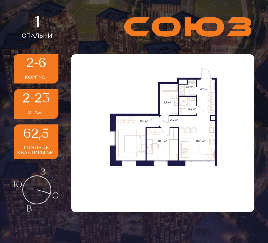 Продаётся 2-комнатная квартира площадью 62.5 м² на 2 этаже в Жилом Комплексе "Союз". Уникальный жилой спортивно-оздоровительный квартал с рекордным количеством олимпийских видов спорта, доступных жителям 24/7. Из 9 га застройки 7га отданы под спортивную инфраструктуру. В открытом доступе у жителей спортивно-оздоровительного кластера юности и здоровья: - Ледовая арена для хоккея и фигурного катания, - Футбольные поля для тренировок, - Спортивный зал для фехтования, - Бассейн на 6 дорожек, - Центр единоборств, - 4 крытых площадки для настольного тенниса, - 7 теннисных кортов (крытых и открытых), - 4 крытых площадки для сквоша, - Легкоатлетический стадион, - площадки для баскетбола и волейбола. На выбор будущим жильцам ЖК представляется 3 вида балконов, различные гардеробные и просторные холлы, продуманные планировочные решения с мастер-спальнями, кабинетами, санузлами, постирочными, а также панорамное остекление. Комплекс оснащен разнообразной собственной инфраструктурой. На территории ЖК есть зона для пикников, розарий, сосновые, каштановые и дубовые аллеи, площадки ворк-аута и йоги, а также ресторан «ШАБАДА» Сосо Павлиашвили с просторной прогулочной зоной с водными элементами, садом ароматных трав и открытой сценой. В благоустройство квартала входит закрытый и безопасный двор, фонтан, арт-объекты, световой дизайн, интерактивные площадки для детей разных возрастов. Рядом с Комплексом располагается большое количество локаций, способствующих активному времяпрепровождению: - Парк Будущего, - Леоновская роща, - Национальный парк, - Лосиный остров, - Парк Сокольники, - Главный Ботанический сад, - РАН, - ВДНХ, - Парк Останкино, - Парк Свиблово, - Пойма реки Яуза.О застройщике
