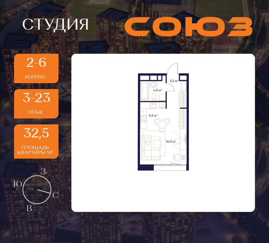 Продаётся квартира-студия площадью 32.5 м² на 3 этаже в Жилом Комплексе "Союз". Уникальный жилой спортивно-оздоровительный квартал с рекордным количеством олимпийских видов спорта, доступных жителям 24/7. Из 9 га застройки 7га отданы под спортивную инфраструктуру. В открытом доступе у жителей спортивно-оздоровительного кластера юности и здоровья: - Ледовая арена для хоккея и фигурного катания, - Футбольные поля для тренировок, - Спортивный зал для фехтования, - Бассейн на 6 дорожек, - Центр единоборств, - 4 крытых площадки для настольного тенниса, - 7 теннисных кортов (крытых и открытых), - 4 крытых площадки для сквоша, - Легкоатлетический стадион, - площадки для баскетбола и волейбола. На выбор будущим жильцам ЖК представляется 3 вида балконов, различные гардеробные и просторные холлы, продуманные планировочные решения с мастер-спальнями, кабинетами, санузлами, постирочными, а также панорамное остекление. Комплекс оснащен разнообразной собственной инфраструктурой. На территории ЖК есть зона для пикников, розарий, сосновые, каштановые и дубовые аллеи, площадки ворк-аута и йоги, а также ресторан «ШАБАДА» Сосо Павлиашвили с просторной прогулочной зоной с водными элементами, садом ароматных трав и открытой сценой. В благоустройство квартала входит закрытый и безопасный двор, фонтан, арт-объекты, световой дизайн, интерактивные площадки для детей разных возрастов. Рядом с Комплексом располагается большое количество локаций, способствующих активному времяпрепровождению: - Парк Будущего, - Леоновская роща, - Национальный парк, - Лосиный остров, - Парк Сокольники, - Главный Ботанический сад, - РАН, - ВДНХ, - Парк Останкино, - Парк Свиблово, - Пойма реки Яуза.О застройщике