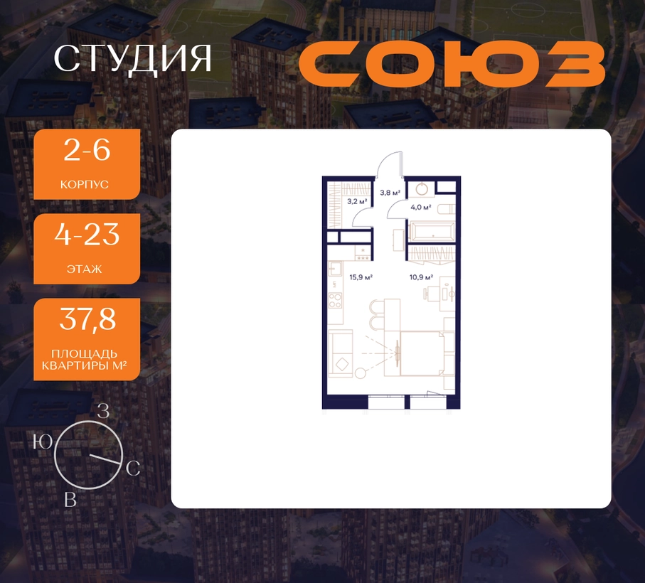 Продаётся квартира-студия площадью 37.8 м² на 4 этаже в Жилом Комплексе "Союз". Уникальный жилой спортивно-оздоровительный квартал с рекордным количеством олимпийских видов спорта, доступных жителям 24/7. Из 9 га застройки 7га отданы под спортивную инфраструктуру. В открытом доступе у жителей спортивно-оздоровительного кластера юности и здоровья: - Ледовая арена для хоккея и фигурного катания, - Футбольные поля для тренировок, - Спортивный зал для фехтования, - Бассейн на 6 дорожек, - Центр единоборств, - 4 крытых площадки для настольного тенниса, - 7 теннисных кортов (крытых и открытых), - 4 крытых площадки для сквоша, - Легкоатлетический стадион, - площадки для баскетбола и волейбола. На выбор будущим жильцам ЖК представляется 3 вида балконов, различные гардеробные и просторные холлы, продуманные планировочные решения с мастер-спальнями, кабинетами, санузлами, постирочными, а также панорамное остекление. Комплекс оснащен разнообразной собственной инфраструктурой. На территории ЖК есть зона для пикников, розарий, сосновые, каштановые и дубовые аллеи, площадки ворк-аута и йоги, а также ресторан «ШАБАДА» Сосо Павлиашвили с просторной прогулочной зоной с водными элементами, садом ароматных трав и открытой сценой. В благоустройство квартала входит закрытый и безопасный двор, фонтан, арт-объекты, световой дизайн, интерактивные площадки для детей разных возрастов. Рядом с Комплексом располагается большое количество локаций, способствующих активному времяпрепровождению: - Парк Будущего, - Леоновская роща, - Национальный парк, - Лосиный остров, - Парк Сокольники, - Главный Ботанический сад, - РАН, - ВДНХ, - Парк Останкино, - Парк Свиблово, - Пойма реки Яуза.О застройщике