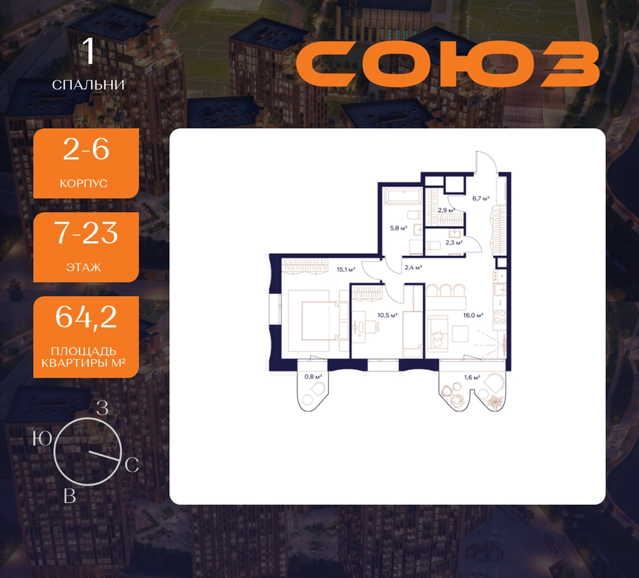 Продаётся 2-комнатная квартира площадью 64.2 м² на 7 этаже в Жилом Комплексе "Союз". Уникальный жилой спортивно-оздоровительный квартал с рекордным количеством олимпийских видов спорта, доступных жителям 24/7. Из 9 га застройки 7га отданы под спортивную инфраструктуру. В открытом доступе у жителей спортивно-оздоровительного кластера юности и здоровья: - Ледовая арена для хоккея и фигурного катания, - Футбольные поля для тренировок, - Спортивный зал для фехтования, - Бассейн на 6 дорожек, - Центр единоборств, - 4 крытых площадки для настольного тенниса, - 7 теннисных кортов (крытых и открытых), - 4 крытых площадки для сквоша, - Легкоатлетический стадион, - площадки для баскетбола и волейбола. На выбор будущим жильцам ЖК представляется 3 вида балконов, различные гардеробные и просторные холлы, продуманные планировочные решения с мастер-спальнями, кабинетами, санузлами, постирочными, а также панорамное остекление. Комплекс оснащен разнообразной собственной инфраструктурой. На территории ЖК есть зона для пикников, розарий, сосновые, каштановые и дубовые аллеи, площадки ворк-аута и йоги, а также ресторан «ШАБАДА» Сосо Павлиашвили с просторной прогулочной зоной с водными элементами, садом ароматных трав и открытой сценой. В благоустройство квартала входит закрытый и безопасный двор, фонтан, арт-объекты, световой дизайн, интерактивные площадки для детей разных возрастов. Рядом с Комплексом располагается большое количество локаций, способствующих активному времяпрепровождению: - Парк Будущего, - Леоновская роща, - Национальный парк, - Лосиный остров, - Парк Сокольники, - Главный Ботанический сад, - РАН, - ВДНХ, - Парк Останкино, - Парк Свиблово, - Пойма реки Яуза.О застройщике