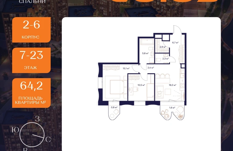 Продаётся 2-комнатная квартира площадью 64.2 м² на 7 этаже в Жилом Комплексе "Союз". Уникальный жилой спортивно-оздоровительный квартал с рекордным количеством олимпийских видов спорта, доступных жителям 24/7. Из 9 га застройки 7га отданы под спортивную инфраструктуру. В открытом доступе у жителей спортивно-оздоровительного кластера юности и здоровья: - Ледовая арена для хоккея и фигурного катания, - Футбольные поля для тренировок, - Спортивный зал для фехтования, - Бассейн на 6 дорожек, - Центр единоборств, - 4 крытых площадки для настольного тенниса, - 7 теннисных кортов (крытых и открытых), - 4 крытых площадки для сквоша, - Легкоатлетический стадион, - площадки для баскетбола и волейбола. На выбор будущим жильцам ЖК представляется 3 вида балконов, различные гардеробные и просторные холлы, продуманные планировочные решения с мастер-спальнями, кабинетами, санузлами, постирочными, а также панорамное остекление. Комплекс оснащен разнообразной собственной инфраструктурой. На территории ЖК есть зона для пикников, розарий, сосновые, каштановые и дубовые аллеи, площадки ворк-аута и йоги, а также ресторан «ШАБАДА» Сосо Павлиашвили с просторной прогулочной зоной с водными элементами, садом ароматных трав и открытой сценой. В благоустройство квартала входит закрытый и безопасный двор, фонтан, арт-объекты, световой дизайн, интерактивные площадки для детей разных возрастов. Рядом с Комплексом располагается большое количество локаций, способствующих активному времяпрепровождению: - Парк Будущего, - Леоновская роща, - Национальный парк, - Лосиный остров, - Парк Сокольники, - Главный Ботанический сад, - РАН, - ВДНХ, - Парк Останкино, - Парк Свиблово, - Пойма реки Яуза.О застройщике