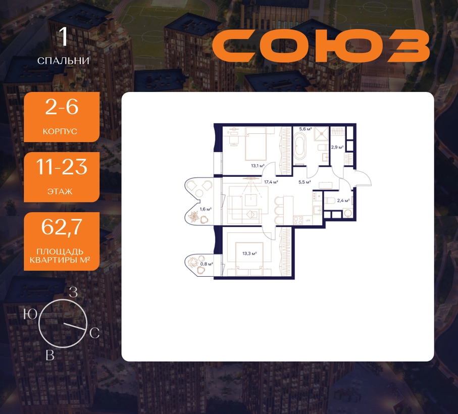 Продаётся 2-комнатная квартира площадью 62.7 м² на 11 этаже в Жилом Комплексе «Союз».