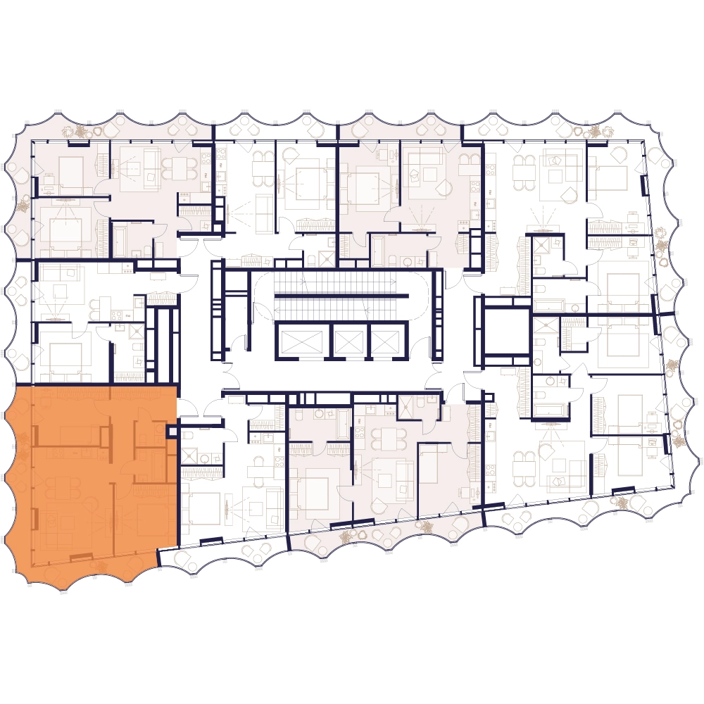 Уникальные форматы квартир с мастер-спальнями, приватными террасами, балконами, а также пентхаусы с открыточными видами на город.